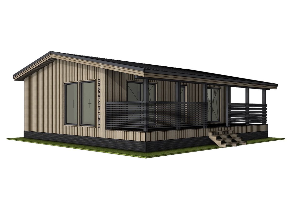 Линейные размеры дома 10х10 м, жилая площадь 10х7,5 терраса 10х2,5 м. В доме разместятся кухня-гостиная, 2 спальни, совмещенный СУ, тех.помещение, прихожая.
