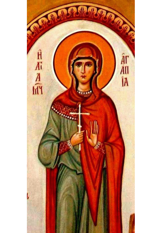 Дева-мученица. Одна из трех фессалоникийских сестер, принявших христианство, которые были замучены Диоклетианом за отказ подчиниться его указу от 303 года, запрещавшему хранение Священных текстов. Во время суда, устроенного Дульцитием, римским наместником Македонии, три сестры — Агапия, Хиония и Ирина — отказались принести жертву или воскурить благовония римским божествам. Агапия и Хиония были сожжены заживо, а Ирина была приговорена к жизни в публичном доме и впоследствии приняла мученическую смерть. Агапия, редкая тема в христианском искусстве, обычно изображалась вместе со своими сёстрами либо в эпизоде их суда, либо в эпизоде их мученичества, либо в качестве духовной наставницы, держащей в руках христианское писание и пальмовую ветвь. Если вам понравилась статья, поставьте, пожалуйста, лайк. А ещё лучше подписывайтесь на наш канал. Дальше будет ещё интересней.