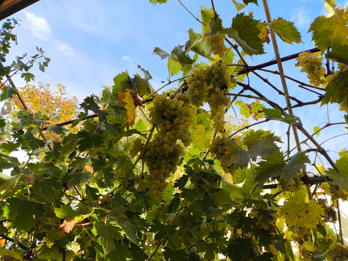 Странное желание в середине октября, но желание клиента читателя — закон. Так что хотите, не хотите, а смотрите, что творится в моём огороде. Виноград ещё не весь убрали, оставили на еду. Тот, что собрали раньше, перебродил, и ждёт, пока я его по банкам разолью. Надеюсь, что получится не уксус, а вино. Хотя уксус у меня тоже очень вкусный. Но, правда с прошлого года много: яблочный, инжирный, винный. Кольраби ещё на грядке, потихоньку вырываем, едим, погода пока не гонит. Муж разобрал поликарбонат на теплице, переварил, покрасил, так что пока зимнего огорода нет, а осенний хорошо себя чувствует. Цветут георгины, настурции, алиссумы. Жду пышную красоту хризантем. Пастернак ещё на грядке, я его немного сажаю, только недавно научилась выращивать. На убранном огороде вылезли пара кустов картошки и взошли томаты. Топинамбур растёт, его ещё рано выкапывать. Малина пока ещё зелёная. На клумбе сам по себе вырос арбуз. Розы цветут уходящей красой. Ждём и мы похолодания, идёт с Москвы
