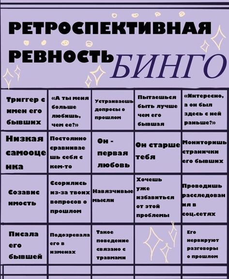 В-пятых, собственно компульсивное мышление (ОКР-тип ревности) — когда человек буквально застревает в навязчивых мыслях о прошлом. И здесь стоит серьезно отнестись к симптомам и обратиться к психиатру, который может назначить адекватное лечение. Стоит также присмотреться к тому были ли у вас те или иные навязчивости в прошлом (даже те, которые были не связаны с темой отношений и вообще с темой социума).