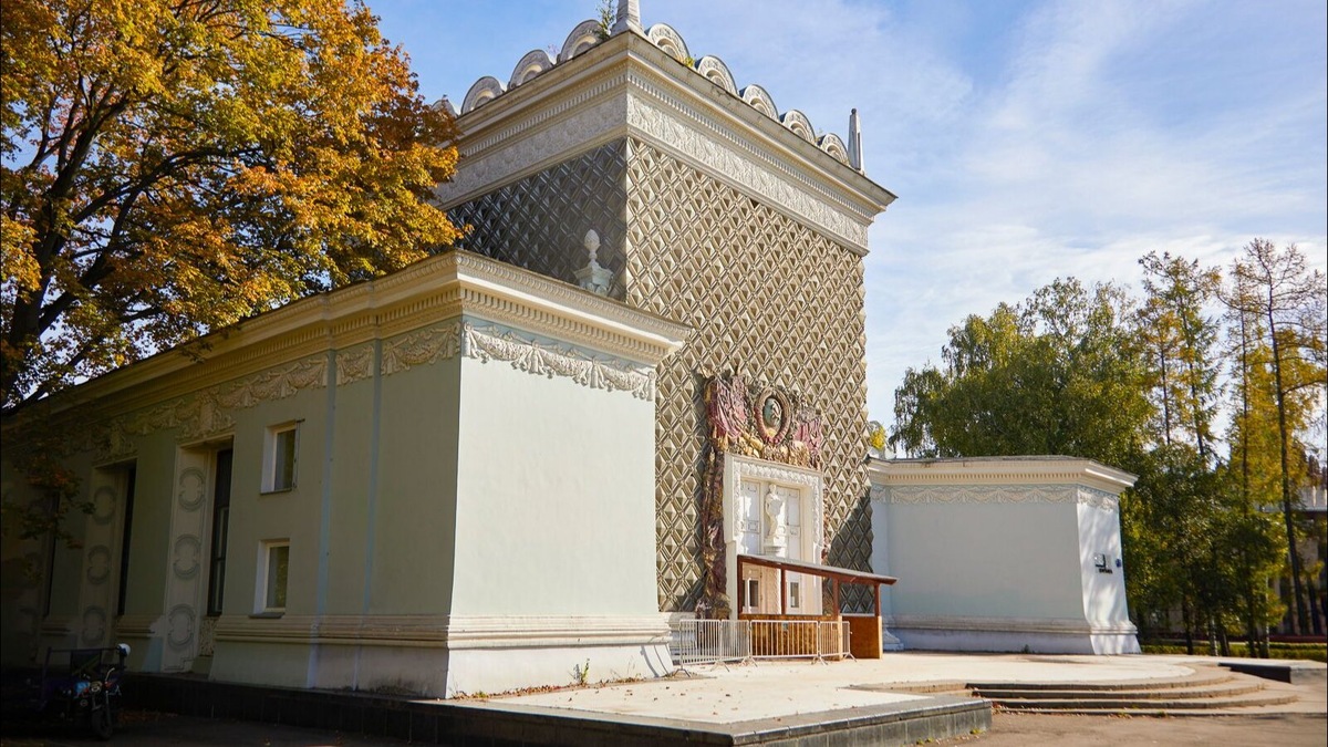Это здание — настоящий памятник архитектуры федерального значения, построенный в 1954 году. Особую ценность представляет его центральная часть: металлический каркас, заполненный крупными стеклянными блоками гранёной формы. А скульптурный рельеф у главного входа и вовсе облицован цветной смальтой — редкий и эффектный приём для того времени. Интересно, что за свою историю павильон сменил несколько назначений. Изначально здесь демонстрировали строительные изделия и архитектурные детали, затем разместилось Всероссийское общество охраны природы. В 2000-е годы сюда приходили любители авторской песни, а с 2017 года работает Международный центр балета. Реставраторы обещают вернуть зданию его первоначальный облик. Особое внимание уделят уникальному фасаду из стеклянных блоков — визитной карточке павильона. Также восстановят утраченные элементы декора: барельефы, вазы на парапете, деревянные двери с латунными и бронзовыми накладками, исторические окна. После реставрации стены павильона вновь ста