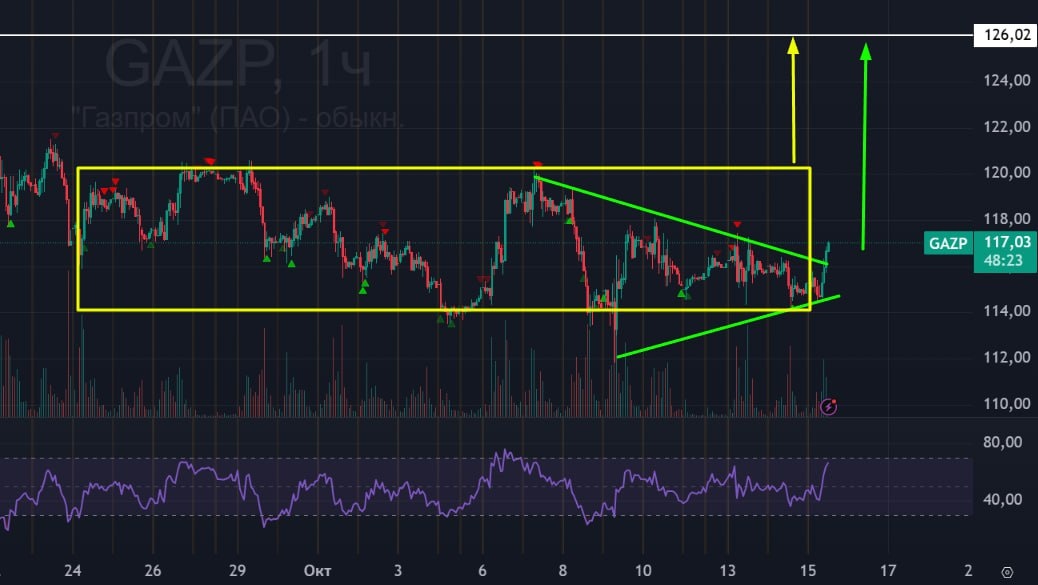 В ответ на пост ⛽️ Газпром 🟢 Вот тут писал, что Газпром впитывает весь негатив, находясь на десятилетних минимумах. 🟢 Локальная картинка: ©️Если тут треугольник, то уже его пробиваем вверх - рост будет на высоту треугольника до 126. ©️Если тут желтое накопление, то будет рост на его высоту до 126 руб. 🚗 Как ни рисуй, всё равно получишь 126! #ГАЗПРОМ #GAZP #GAZPF #bogdanoffinvest