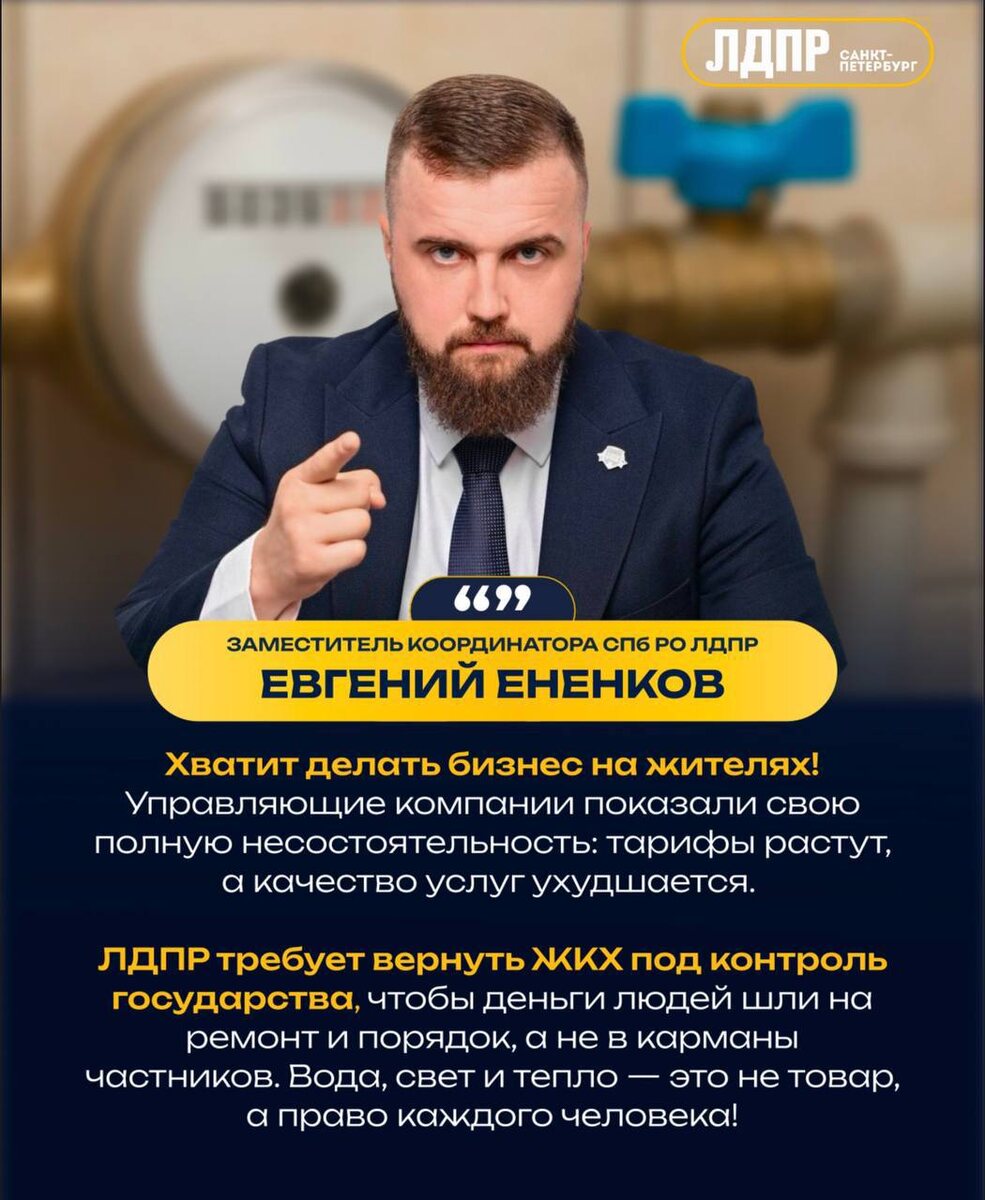 Опять платить за воздух? ЖКХ Петербурга выходит из-под контроля Жители Санкт-Петербурга всё чаще сталкиваются с ростом тарифов, низким качеством услуг и бездействием управляющих компаний. Система, которая должна работать на людей, превратилась в источник прибыли для частников. Результат - аварии, перерасчёты и бесконечные жалобы. Сегодня очевидно: частная модель управления ЖКХ себя исчерпала. Прибыль важнее комфорта граждан, а ответственность размыта. Пора навести порядок! ЛДПР ТРЕБУЕТ ВЕРНУТЬ ЖКХ ПОД КОНТРОЛЬ ГОСУДАРСТВА! Только возвращение коммунальной инфраструктуры в государственные руки обеспечит прозрачность, справедливость и контроль за каждым рублём. Евгений Ененков, заместитель координатора: «Хватит делать бизнес на жителях! Управляющие компании показали свою полную несостоятельность: тарифы растут, а качество услуг ухудшается. ЛДПР требует вернуть ЖКХ под контроль государства, чтобы деньги людей шли на ремонт и порядок, а не в карманы частников. Вода, свет и тепло - это не