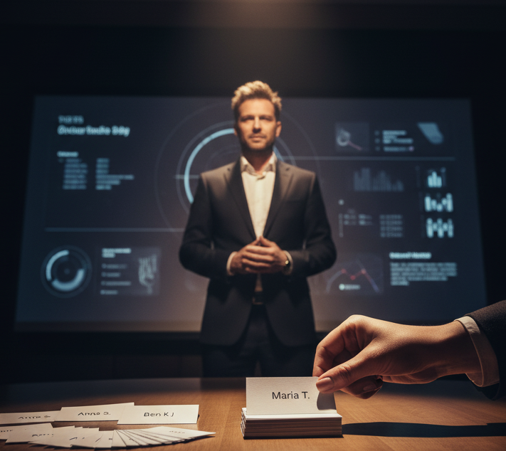 На слайде — его имя крупно, фамилии остальных — мелко внизу. Я вижу два наших решения на графике, но в словах они исчезают. — «Минуту, добавлю контекст по эксперименту Б», — говорю спокойно.