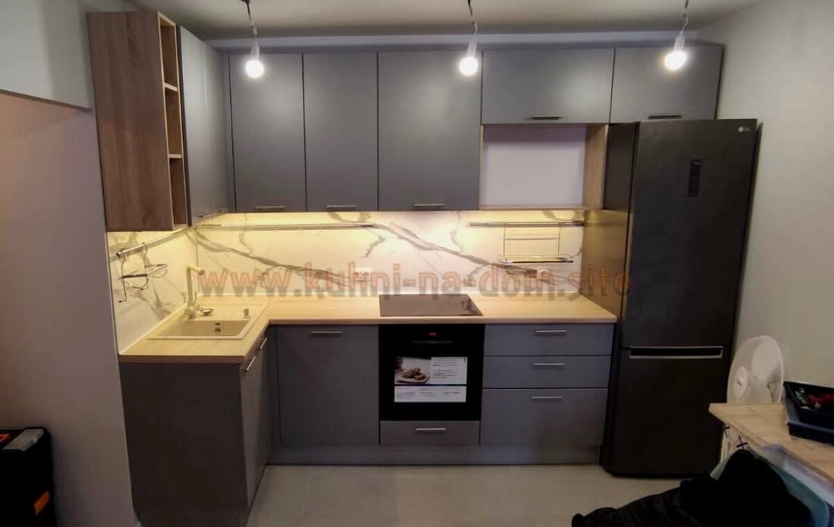 Стильная светлая кухня MRAMO LUSSO Кухонный светло-серый гарнитур в современном стиле MRAMO LUSSO был изготовлен по индивидуальному проекту для установки в квартире в г.Москва. Фасады гарнитура изготовлены из МДФ в плёнке ПВХ в сером цвете Бакарди Р-129. Очень хорошо сочетаются между собой фасады и фартук с принтом белого мрамора, что делает кухонную зону более модной и эстетичней. Столешница, которая имитирует дуб, очень хорошо вписывается в интерьер серой кухни. Так же для полного удобства было проведено освещение, которое контролируется кнопками. Заказать проект кухни или записаться на замер kuhni-na-dom.site