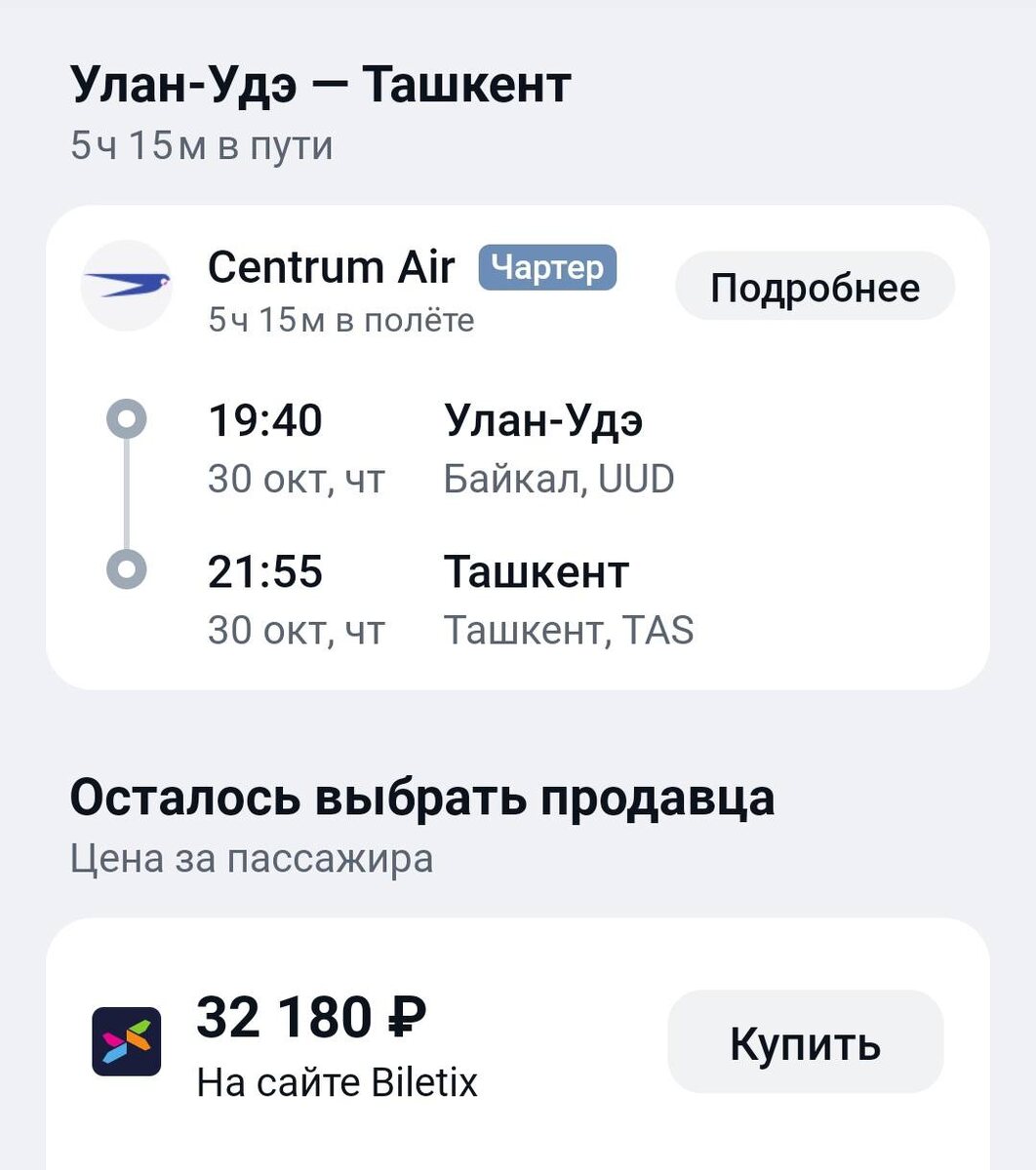 π± ΠΠ· Π£Π»Π°Π½-Π£Π΄Ρ Π² Π£Π·Π±Π΅ΠΊΠΈΡΡΠ°Π½ ΠΏΠΎΡΠ²ΠΈΠ»ΡΡ ΠΏΡΡΠΌΠΎΠΉ ΡΠ΅ΠΉΡ ΠΠ΅ΡΠ²ΡΠΉ ΡΠ΅ΠΉΡ Π²ΡΠ»Π΅ΡΠΈΡ ΠΈΠ· ΡΡΠΎΠ»ΠΈΡΡ ΠΡΡΡΡΠΈΠΈ 30 ΠΎΠΊΡΡΠ±ΡΡ. Π§Π°ΡΡΠ΅ΡΠ½ΡΠΉ ΡΠ°ΠΌΠΎΠ»Π΅Ρ ΠΏΠΎΠ»Π΅ΡΠΈΡ ΠΎΡ Π°Π²ΠΈΠ°ΠΊΠΎΠΌΠΏΠ°Π½ΠΈΠΈ Centrum Air. ΠΡΠ΅ΠΌΡ Π² ΠΏΡΡΠΈ ΡΠΎΡΡΠ°Π²ΠΈΡ 5 ΡΠ°ΡΠΎΠ² 15 ΠΌΠΈΠ½ΡΡ. π² ΠΠΎΠ΄ΠΏΠΈΡΡΠ²Π°ΠΉΡΡ Π½Π° Π½Π°Ρ Π² ΠΠΠ₯