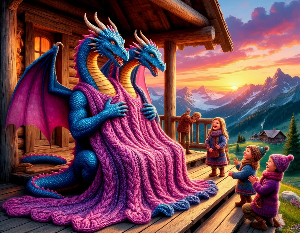 И случилось чудо. Не сразу, но их совместные усилия начали давать плоды. Сначала получился бесформенный, но очень теплый шарф. Потом — варежки такие огромные, что в каждой могла бы уместиться избушка на курьих ножках. А однажды, вдохновленный закатом, Змей Горыныч связал нечто удивительное.