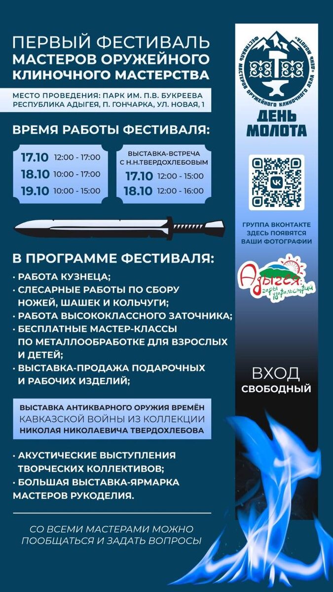 С 17 по 19 октября в Адыгее пройдет еще один уникальный и интереснейший Фестиваль! Первый Фестиваль оружейного клиночного мастерства «День Молота». Вы заметили, что большинство фестивалей и событийных мероприятий республики направлены не просто на развлечение, а на сохранение исконных традиций и/или культурного наследия? Традиций сыроварения, традиций кузнечного ремесла, сохранения памятников исторического и археологического значения. Это вызывает искреннее восхищение и уважение! Каждое такое мероприятие несет в себе огромную ценность и миссию. Поэтому для нас важно по-возможности поддерживать их 🙏 С удовольствием выступили партнерами Фестиваля оружейного клиночного мастерства, особенно потому, что кузнечное дело - большая страсть одного из сооснователей AdyGo - Михаила 😊 Приглашаем всех влюбленных в ремесло или желающих прикоснуться к нему провести эти выходные в удивительном и природном уголке - Парке им. Н.В. Букреева (о нем мы ещё непременно расскажем отдельно). А для тех к