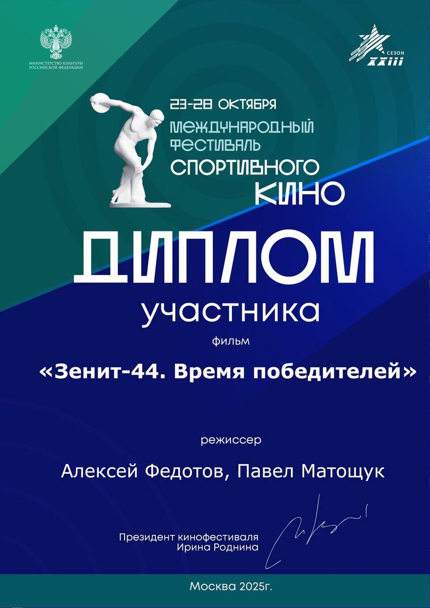 Наш «Зенит-44. Время победителей» стал участником МФСК 🥳 Международный фестиваль спортивного кино «KRASNOGORSKI» (МФСК) – одно из самых ярких культурных событий международного значения и на сегодняшний день является крупнейшим спортивным кино конкурсом в Восточной Европе и странах СНГ. Кинофестиваль проходит ежегодно, начиная с 2003 года. ➡️Ирина Роднина - президент фестиваля, трехкратная олимпийская чемпионка, десятикратная чемпионка мира по фигурному катанию, депутат Государственной Думы: «Этот фестиваль – мост между спортом и искусством. Мы показываем, как кино может вдохновлять на победы и рассказывать удивительные человеческие истории». 💙💙💙💙💙💙💙💙💙💙 «Зенит-44. Время победителей» объединяет разные поколения футболистов и болельщиков не только футбольного клуба «Зенит», но и других команд-участников кубка СССР 1944 года. ⚪ Фильм расскажет о первом трофее ленинградского «Зенита», ознаменовавшем новую главу в истории клуба. Можно сказать, что именно Кубок 1944 года положи