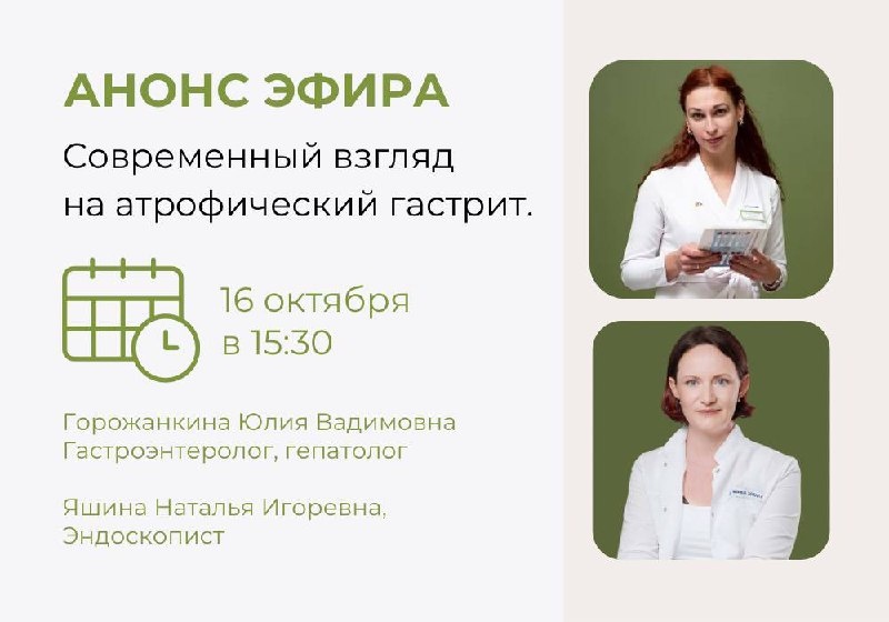 Современный взгляд на атрофический гастрит: мифы и реальность 🗓 16 октября в 15:30 📍 Прямой эфир пройдёт в нашей группе ВКонтакте Что на самом деле представляет собой атрофический гастрит? Можно ли его вылечить и как не упустить момент, когда атрофия только начинается? На эти и другие вопросы ответят: 👩⚕️ Наталья Игоревна Яшина — врач-эндоскопист 👩⚕️ Юлия Вадимовна Горожанкина — врач-гастроэнтеролог Обсудим: ❔ Что такое атрофический гастрит и чем он опасен? ❔ Когда можно заподозрить атрофию? ❔ Кто входит в группу риска? ❔ Основные причины развития заболевания ❔ Как проводится диагностика и почему важно своевременное обследование ❔ Разбор эндоскопии по OLGA — как определить риски прогрессирования атрофии ❔ Современные подходы к лечению и наблюдению пациентов Вы узнаете, какие методы диагностики и терапии действительно работают, а какие — всего лишь мифы. ⬇️Пишите свои вопросы в комментариях — специалисты ответят на них в конце прямого эфира!