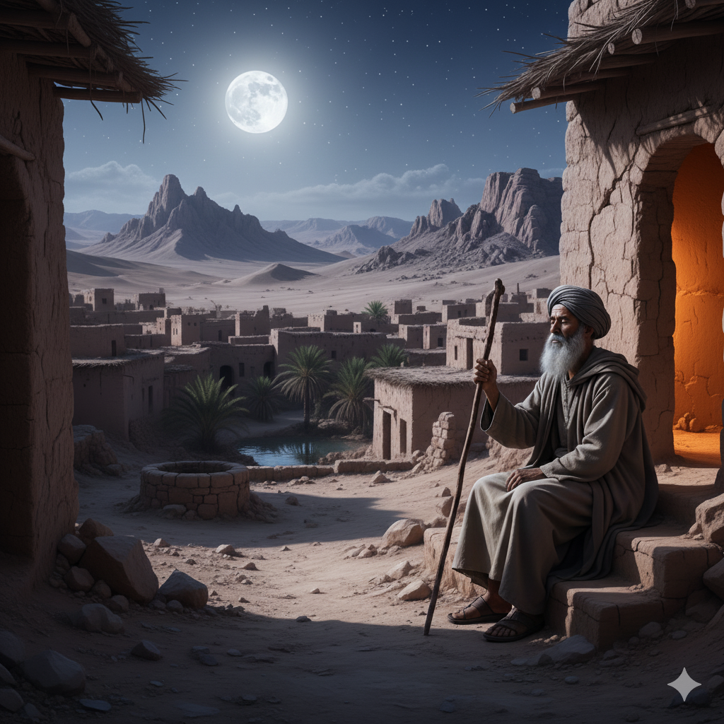 На пути мне повстречался почтенный старец в опрятных одеждах, источавших благоухание. Я приветствовал его и взмолился: "О почтенный! Защити меня от этого чудовища, да убережёт тебя Аллах!" Старец прослезился и произнёс: "Увы, я немощен, а это существо обладает несравненно большей силой. Я бессилен перед ним. Беги дальше с ещё большей скоростью, быть может, Всевышний ниспошлёт тебе спасителя".