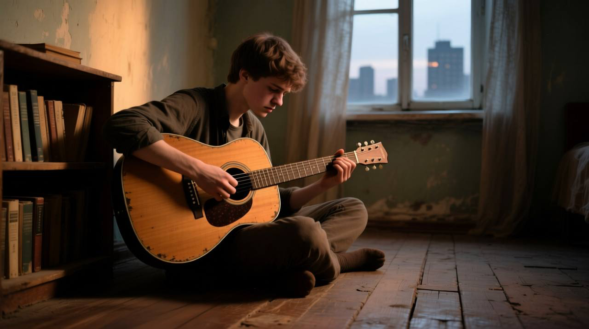 Шум дождя за окном заглушал тихий перебор струн. Борис снова сидел на кухне со своей старой, потертой гитарой. Инструмент был не лучшего качества, дребезжал, но это была его отдушина, его единственный способ не задохнуться в серой реальности. Мечта о большой сцене, о стадионах, поющих его песни, жила в нем с детства. Но сейчас она казалась такой же далекой, как и солнце за ноябрьскими тучами.