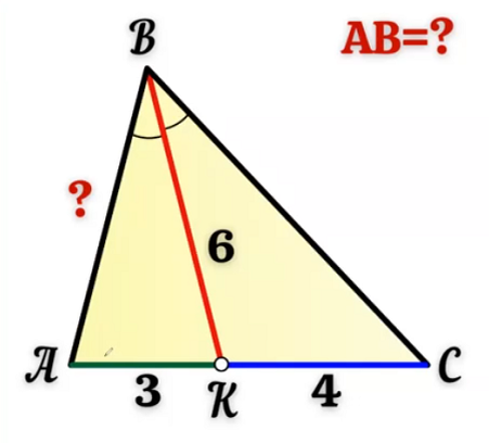 Рассмотрим решение геометрической задачи, решённой на канале Валерия Казакова с помощью формулы, которую знает не всякий школьник. Задача дана под заголовком «Секретная формула! Завал в профильном классе!». Итак, задача. 1. В треугольнике ABC провели биссектрису BK. Она разделила сторону AC на отрезки AK = 3 и KC = 4. Найдите длину стороны AB, если BK= 6. Заключительный кадр решения выглядит так. Источник. Секретная формула! Завал в профильном классе! | Наглядная геометрия | Дзен Валерий Казаков доказал формулу для квадрата биссектрисы угла треугольника, а потом с её помощью нашёл длину стороны AB. Но проблема заключается в том, что не все учащиеся знают эту формулу, её нет в учебниках, поэтому при решении задачи формулу придётся доказать. А мы решим эту задачу, используя классический для этой задачи метод — применим теорему косинусов. Решение. По свойству биссектрисы угла треугольника
