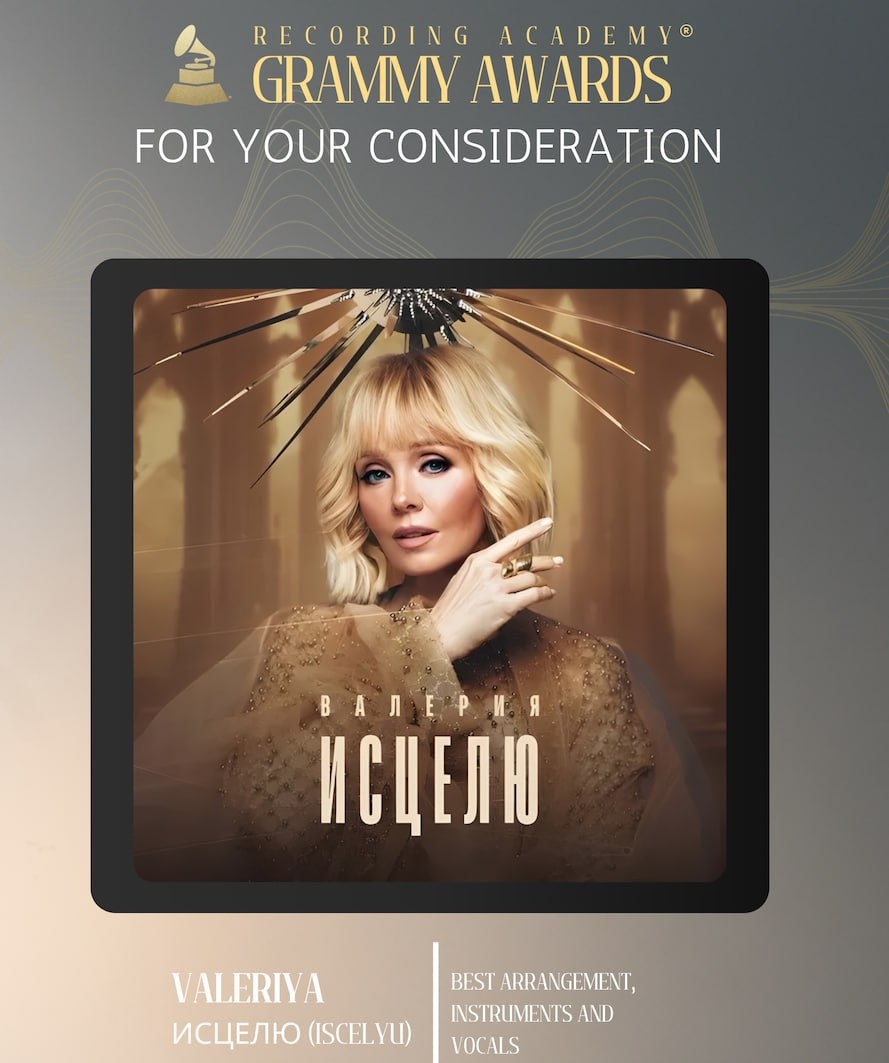 ЧТО: Валерия может попасть на ГРЭММИ. Трек певицы «Исцелю» прошёл в отборочный этап и теперь поборется за номинацию.