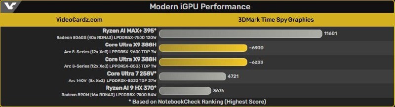 Появились первые результаты тестирования мобильных процессоров Panther Lake. Флагманская модель X9 388H с 12 ядрами и графикой iGPU Xe3 показывает в 3DMark Time Spy с памятью LPDDR5X‑9600 до 6300 баллов. Это примерно на 33% выше, чем Arc 140V в Core Ultra 7 258V (Lunar Lake), и на 71% быстрее Radeon 890M в Ryzen HX 370 (Strix Point), но при этом на 46% уступает Radeon 8060S в Ryzen AI MAX+ 395 (Strix Halo). Показатель TDP тестируемого экземпляра пока не известен, однако Xe3 обещает значительный прирост производительности графики при низком энергопотреблении, что может быть интересно для игровых ноутбуков и портативных консолей. @techogid
