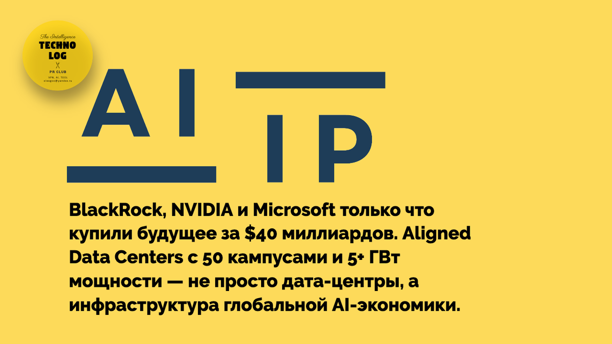 Главная мысль: консорциум AI Infrastructure Partnership под управлением BlackRock, NVIDIA, Microsoft и xAI приобретает Aligned Data Centers за $40 млрд — рекордная сделка, которая превращает управление дата-центрами из локального бизнеса в стратегический актив глобальной AI-экономики.
