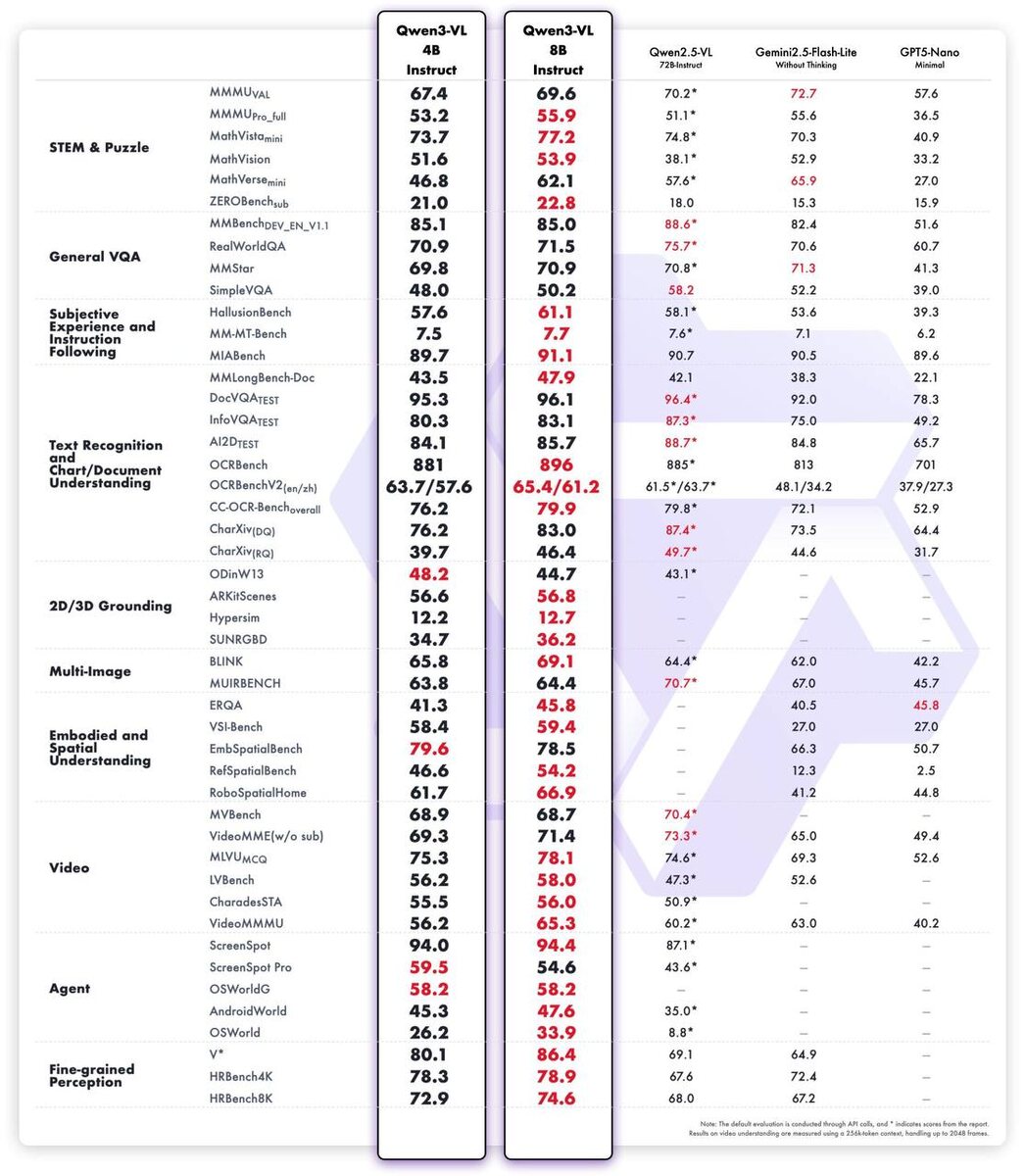 Свежие релизы от Qwen – модели Qwen3 VL Команда представила новые версии Qwen3 VL в конфигурациях 4B и 8B параметров. Это превосходные решения для локального развертывания и дальнейшего обучения. Каждая модель доступна в двух вариантах: Instruct и Thinking. Удивительно, но эти компактные версии по ряду показателей превосходят Gemini 2.5 Flash Lite и GPT-5 Nano. Результаты тестирования показывают, что новинки практически достигли уровня Qwen2.5-VL-72B. Стоит напомнить, что эта модель была выпущена всего полгода назад и являлась топовым решением линейки Qwen. Дополнительно разработчики улучшили эффективность использования видеопамяти и представили варианты в формате FP8. Hugging Face Cookbook INCUBE.AI | ПОДПИСАТЬСЯ