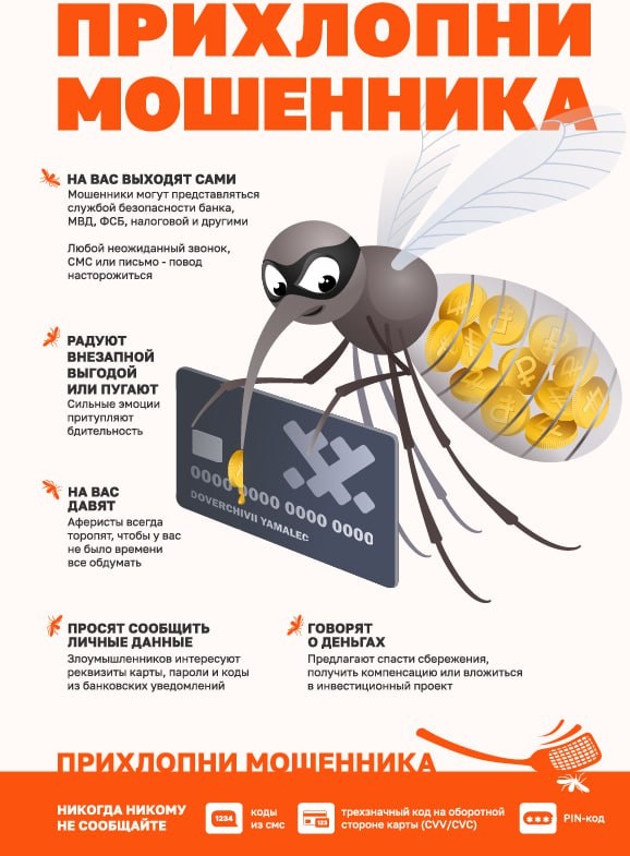 На Ямале объявили войну цифровым «кровопийцам» В регионе запустили информационную кампанию «Прихлопни мошенника!». Её символом стал назойливый северный комар — олицетворение мошенника, пытающегося «высосать» деньги. Несмотря на то, что за 9 месяцев 2024 года количество киберхищений в регионе снизилось на 38%, сумма ущерба всё ещё колоссальна - 455 млн рублей. Яркие памятки с разбором популярных схем обмана уже появились в общественных местах по всему округу. Проект реализуется Координационным центром ЯНАО совместно с МВД и Банком России. В планах - выпуск брошюр, памяток и даже стикерпаков с правилами цифровой гигиены. #прихлопнимошенника