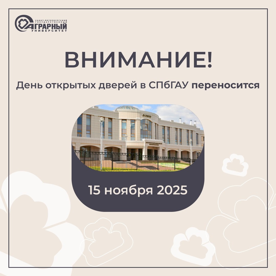 Уважаемые абитуриенты и их родители! Информируем вас о том, что День открытых дверей в Санкт-Петербургском государственном аграрном университете, запланированный на 18 октября, переносится. Новая дата проведения мероприятия – 15 ноября. Приглашаем всех желающих посетить наш университет, узнать больше об институтах, образовательных программах, правилах приема и студенческой жизни. В этот день вы сможете пообщаться с преподавателями, представителями приемной комиссии и студентами, задать интересующие вас вопросы и получить исчерпывающую информацию для принятия важного решения о поступлении. Мы будем рады видеть вас в стенах СПбГАУ 15 ноября! Следите за обновлениями на официальном сайте университета и в наших социальных сетях.