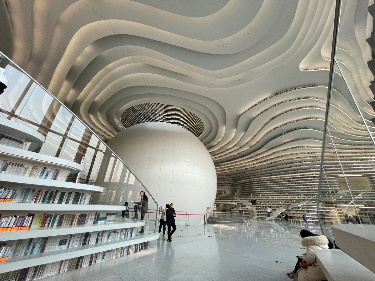 И это не фантастический фильм — это всего лишь библиотека в Тяньцзине. Её интерьер настолько грандиозен и продуман, что первый взгляд на этот белоснежный, волнообразный книжный океан вызывает настоящий вау-эффект и немое восхищение.