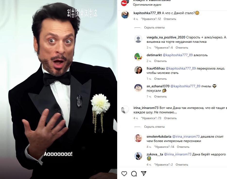 «Очередная борода😆», «За деньги сыграют любую роль артисты. Но тут видны натуральное недовольство его и недоуменность её», «Вот уж два сапога пара два фрика», «Очередная клоунада..». Люди, в отличие от участников шоу, смотрят на ситуацию трезво. Они видят надутое лицо Даны, которое многие списывают на перебор с процедурами: «Что с внешностью Борисовой?», «Борисова окончательно стала жертвой пластических хирургов, то есть фриком». Они отмечают нелепость ситуации: «Больше всего мне нравится третья фотка, где он уже в домашнее переоделся, а она все еще в фате))).