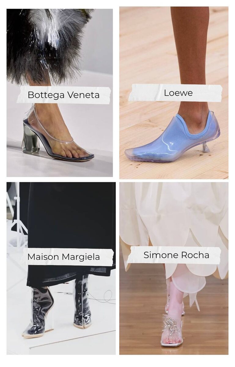 Неделя моды в Париже показала, что обувные тренды 2026 года изменились, но не кардинально. Например, дизайнеры вновь включили в свои коллекции прозрачную обувь, расширив линейку вариантов. Loewe предложили носить пластиковые туфли со вшитым носком. Это поможет избежать скольжения стопы и травм при трении. Bottega Veneta создали универсальную по цвету (прозрачную) обувь, которая подойдет почти к каждому аутфиту. Simone Rocha, судя по акцентным кристаллам и бусинам, вдохновлялись сказочными историями про принцесс. Maison Margiela предлагают не ждать лета, а начать носить бесцветную обувь уже весной. Прозрачные таби на платформе служат тому подтверждением. Фото: Пресс-офисы брендов.