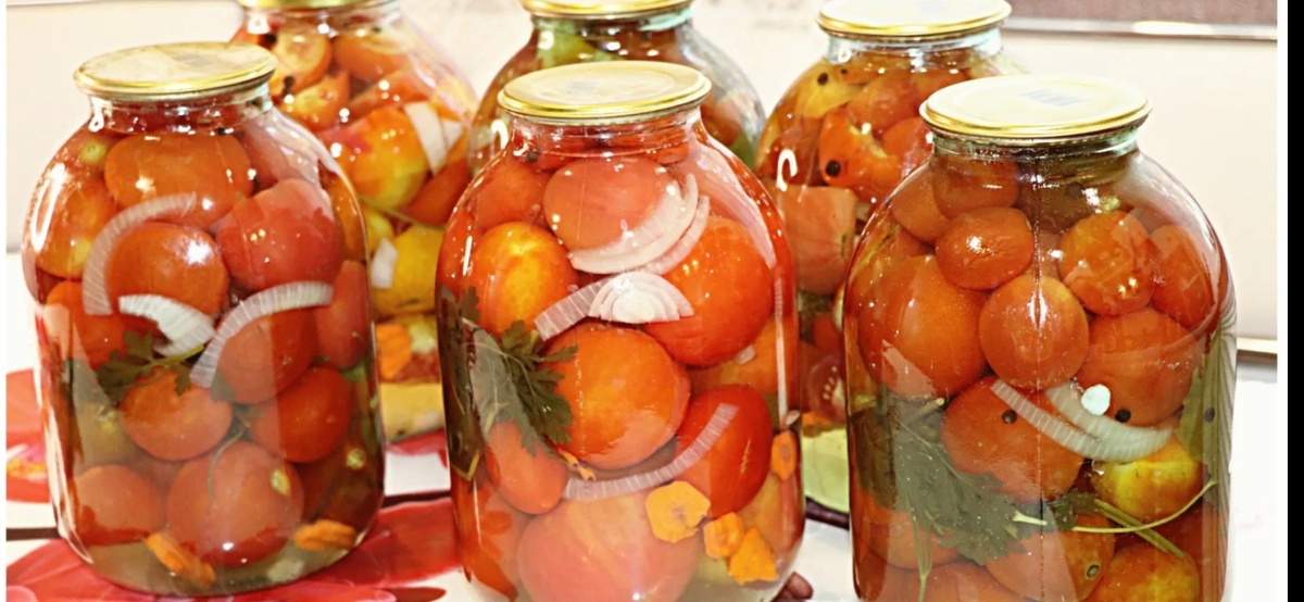 На 3 литровую банку: Помидоры - 2 кг Болгарский перец - 1 шт Морковь - 1/2 шт небольшой (половинка) Лук - 1 шт маленькая ( или половинка) Чеснок - 3- 4 зубчика Петрушка - половина маленького пучка Острый перец - - 1/2 шт ( по желанию) Соль - 2 ст. л. Сахар - 2 ст. л. Уксус 9 % - 2- 3 ст. л. Перец горошком - по вкусу Лавровый лист - 1 шт В стерилизованную чистую банку 3-х литровую укладываем вымытые помидоры, болгарский перец разрезанный на несколько частей, морковь ( тоненькие кружочки) , лук и чеснок на дно банки (тонко порезанные), веточки петрушки, и острый перец, а также лавровый лист и перец горошком. (всë туда) Затем, в кастрюльке кипятим воду (даëм хорошо покипеть) и заливаем помидоры в банке ( осторожно, чтоб не треснула). И пусть стоят так 20 минут. Затем, воду из банки снова выливаем в кастрюльку и даëм ей закипеть. Потом снова ей заливаем помидоры в банке, и даëм постоять ещë 20 минут. Потом опять выливаем воду из банки в кастрюльку, доводим до кипен