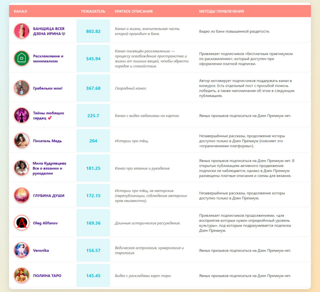 Я думал, что лидирующие позиции займут каналы с «историями из жизни». Но их, на удивление, всего два. Любопытно, что один из этих каналов представляет собой сборник историй других авторов, т.е. в премиуме продаётся доступ к чужом контенту. Удивительно, учитывая, что большинство «писателей Дзена» уже давно освоили генерацию текста с помощью ИИ.