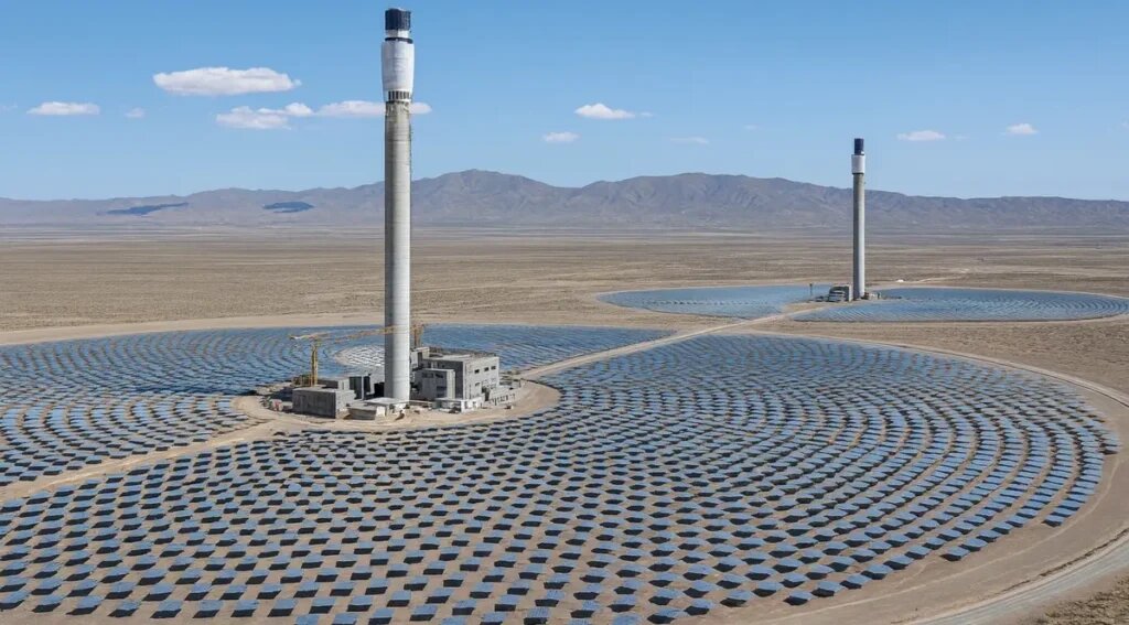 Мировые СМИ опубликовали фотографии огромного массива солнечных панелей, расположенных в Китае. HTNews.ru разобрался, что за невероятный энергетический объект построен в пустыне Гоби (провинция Ганьсу) государственной корпорацией China Three Gorges. Спойлер: это первая в мире двухбашенная солнечно-тепловая электростанция. Ее общая мощность оценивается в примерно 100 Мегаватт. Главная особенность проекта — использование двух башен, работающих на единый генератор. Каждая из них имеет высоту около 200 метров и оборудована приемником, на который направляют свет 27 000 зеркал-гелиостатов. Зеркала автоматически отслеживают движение солнца, концентрируя лучи на приёмниках. Нагретый до температуры около 570 °C теплоноситель (расплавленная соль) аккумулирует энергию и подает ее в паровую турбину, производящую электричество даже ночью. Одна из башен ориентирована на утреннее солнце, вторая — на дневное и вечернее, сообщает канала CCTV. Подобное распределение позволяет станции работать стабильнее