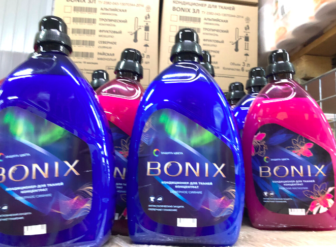В продаже имеется кондиционер Bonix — большой объём 3 литра, ароматы «Северное сияние» и «Райская магнолия». Кондиционер делает ткань мягкой, убирает статическое электричество, придаёт белью лёгкий, ненавязчивый аромат. Стоимость всего 117 рублей, что, согласитесь, недорого для такого объёма. Рядом стоит гель-концентрат для стирки белого и цветного белья БиО. Производитель обещает, что средства хватает на 46 стирок, однако, по отзывам покупателей, дозировку всё-таки приходится немного увеличивать. Зато средство пенится хорошо, подходит и для ручной стирки, и для машин-автомат. Объём 3 литра, цена 230 рублей. Для детских вещей представлен отдельный вариант