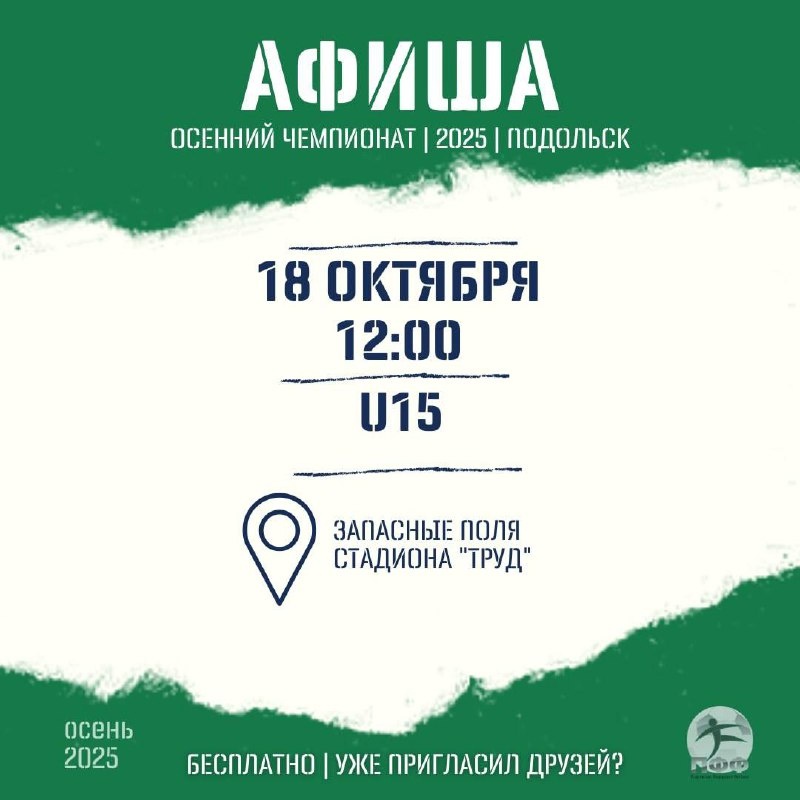 ✨ Осеннего чемпионата ТДК (футбол, Подольская дворовая лига) 🍁18 октября 🍁 U17, U20 - 10:00 U15 - 12:00 🔥Заяви команду и заслужи право сыграть в Суперфинале! 🟠Подробности: vk.com/topic-31270142_54448864 🟠Регистрация: https://forms.yandex.ru/u/68bea5c690fa7b0ac6234a1c/ ‼️Регистрация будет проходить в павильоне с 9:20 до 9:50, НЕ ОПАЗДЫВАЕМ! При себя обязательно иметь документ удостоверяющий личность: паспорт, права или страница госуслуг. 🚫 Возраст: 0+ 📆 18.10.2025 🏢 Спортивный комплекс "Труд" 📍 г. Подольск, ул. Клемента Готвальда, 4, стр. 1 ⭐Поддержать канал голосом 💰 Вакансия - курьер в Подольске ✅ Мероприятия Подольск https://dzen.ru/id/66ed500f7b5671493eca3fd6 http://vk.com/podolsk_events http://dzen.ru/podolsk_events