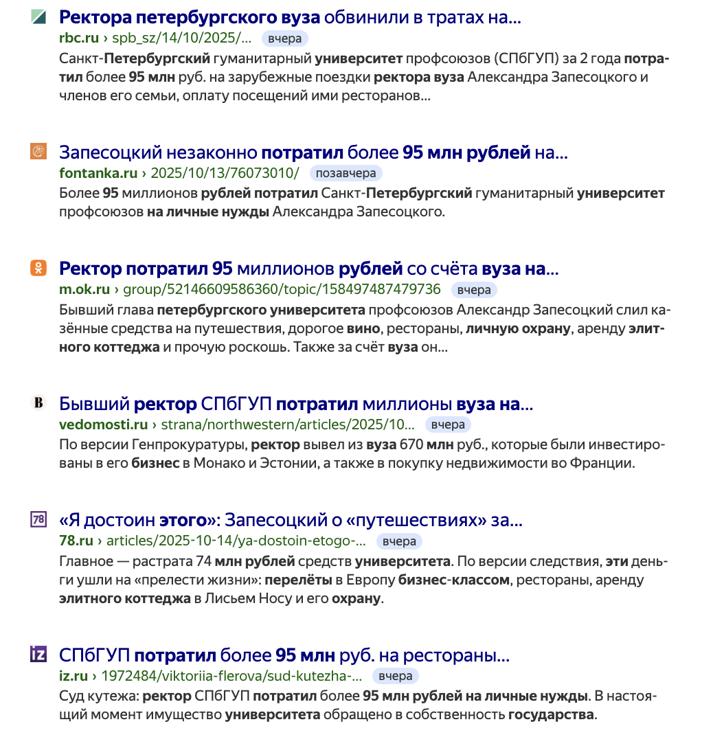 Отстранённого ректора петербургского Университета профсоюзов Александра Запесоцкого выдворили с его же пресс-конференции. Администрация отеля «Введенский», где бывший руководитель вуза собрал журналистов, объявила, что в здании запрещена съёмка, а также начался ремонт. Прессу и самого спикера попросили удалиться. Запесоцкий объявил, что на пресс-конференции намерен дать опровержение опубликованной накануне «Коммерсантом» статьи о многомиллионных расходах бюджета университета на содержание семьи ректора. После начала войны Запесоцкий вывел со счетов вуза 670 миллионов рублей, за счёт которых купил почти за 300 миллионов рублей дом во Франции, а остальное вложил в свой бизнес по управлению недвижимостью в Монако, пишет издание со ссылкой на данные Генпрокуратуры. В 2023-24 годах только на аренду элитного коттеджа в Петербурге, а также охрану особняка и квартиры главы университета учреждение потратило свыше 20 миллионов рублей. Запесоцкий утверждает, что все деньги, взятые им из бюджета в