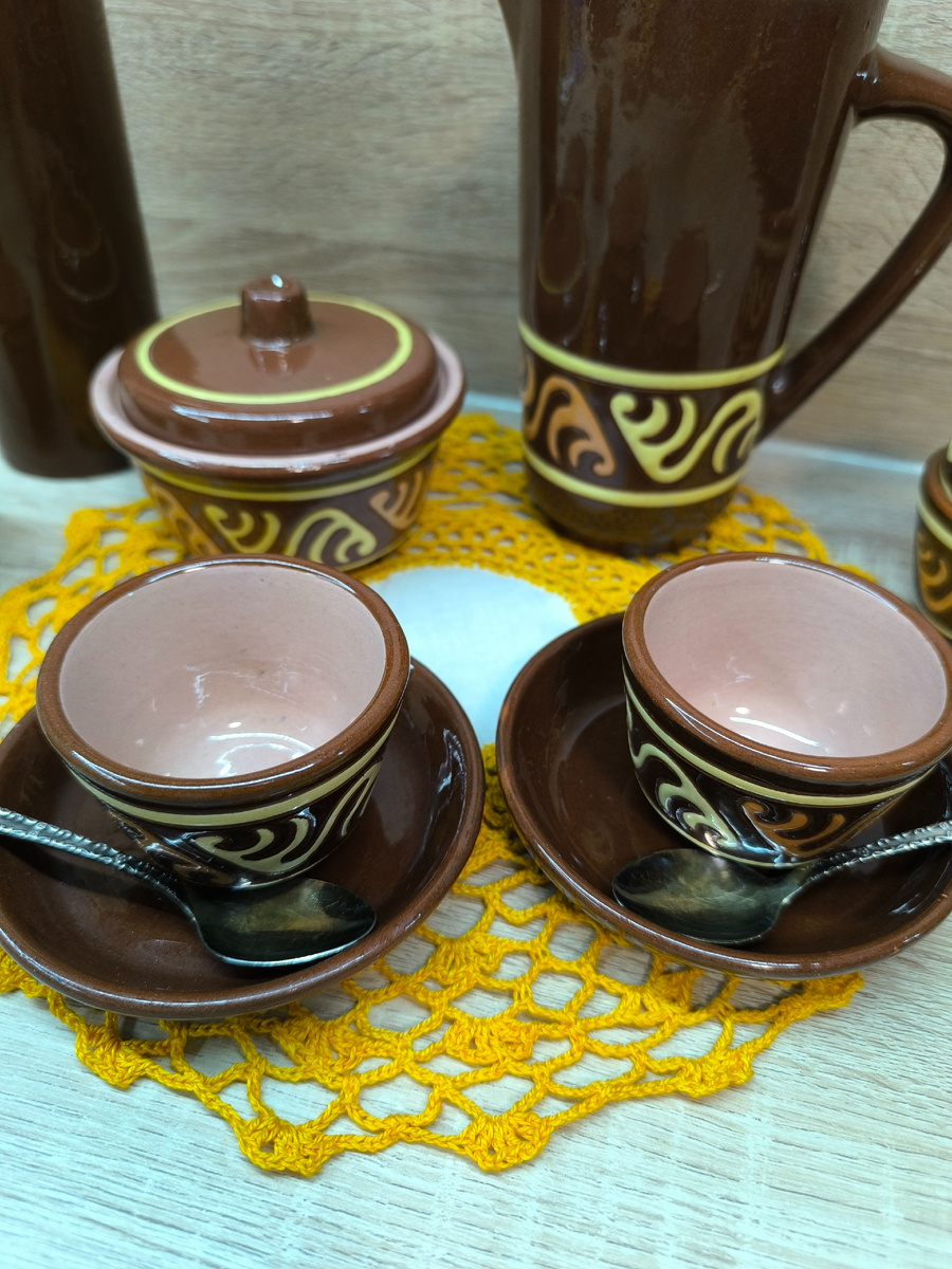 Добрый день или вечер дорогие читатели! Сегодня, хочу рассказать об одном сервизе, который хранится у моей сестры с незапамятных времён. Глиняный кофейный сервиз с интересным орнаментом в завитках, на мой взгляд в восточной стиле. Его истинное предназначение, мне до конца не понятно? Глиняный кофейный сервиз на 6 персон. Состоит из кофейника (или чайника), сахарницы, 6 чашек (возможно пиалок) и уже осталось два блюдца. Ручная роспись, внутри одного цвета обливная керамика с наружи орнамент. Произведен в семидесятые годы прошлого века. Единого клейма нет, но вот на предметах есть цифры и в виде кувшина эмблема, возможно? Или я ошибаюсь? Если кто в курсе производства керамики подскажите? Я погуглила по орнаменту на пиалах - выдает варианты узбекской керамики или башкирской? А если в комплекте с бутылкой - вазочкой от рижского бальзама, по можно отнести к прибалтийскому стилю? Пока загадка. Милая и уютная посуда. Просто винтажные вещи, память о том, что было, но уже исчезло. Благод