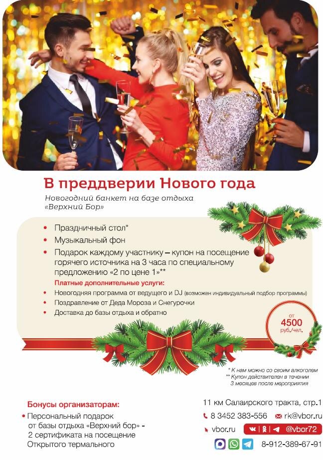 Предновогодний банкет на базе отдыха "ВЕРХНИЙ БОР" : - Красота соснового бора и живописного озера - прекрасные пейзажи для фотосъемки - 3 банкетных зала от 40 до 200 чел https://vbor.ru/organizatsiya-prazdnikov/banketnye-zaly/ - Праздничный стол* - Музыкальный фон - Подарок каждому участнику - купон на посещение горячего источника на 3 часа по специальному предложению «2 по цене 1»** - Возможность разместить гостей в номерах гостиниц или коттеджах базы отдыха Платные дополнительные услуги: - Новогодняя программа от ведущего и DJ (возможен индивидуальный подбор программы) - Поздравление от Деда Мороза и Снегурочки - Велком-зона - Аренда караоке в зале Ресторанного комплекса - Доставка до базы отдыха и обратно *к нам можно со своим алкоголем **купон действует в течении 3х месяцев после мероприятия Подробнее на нашем сайте https://vbor.ru/organizatsiya-prazdnikov/novogodnie-bankety/ Корпоративный тур на природе - https://dzen.ru/media/vbor72/programma-novogodnego-korporativnogo-tura