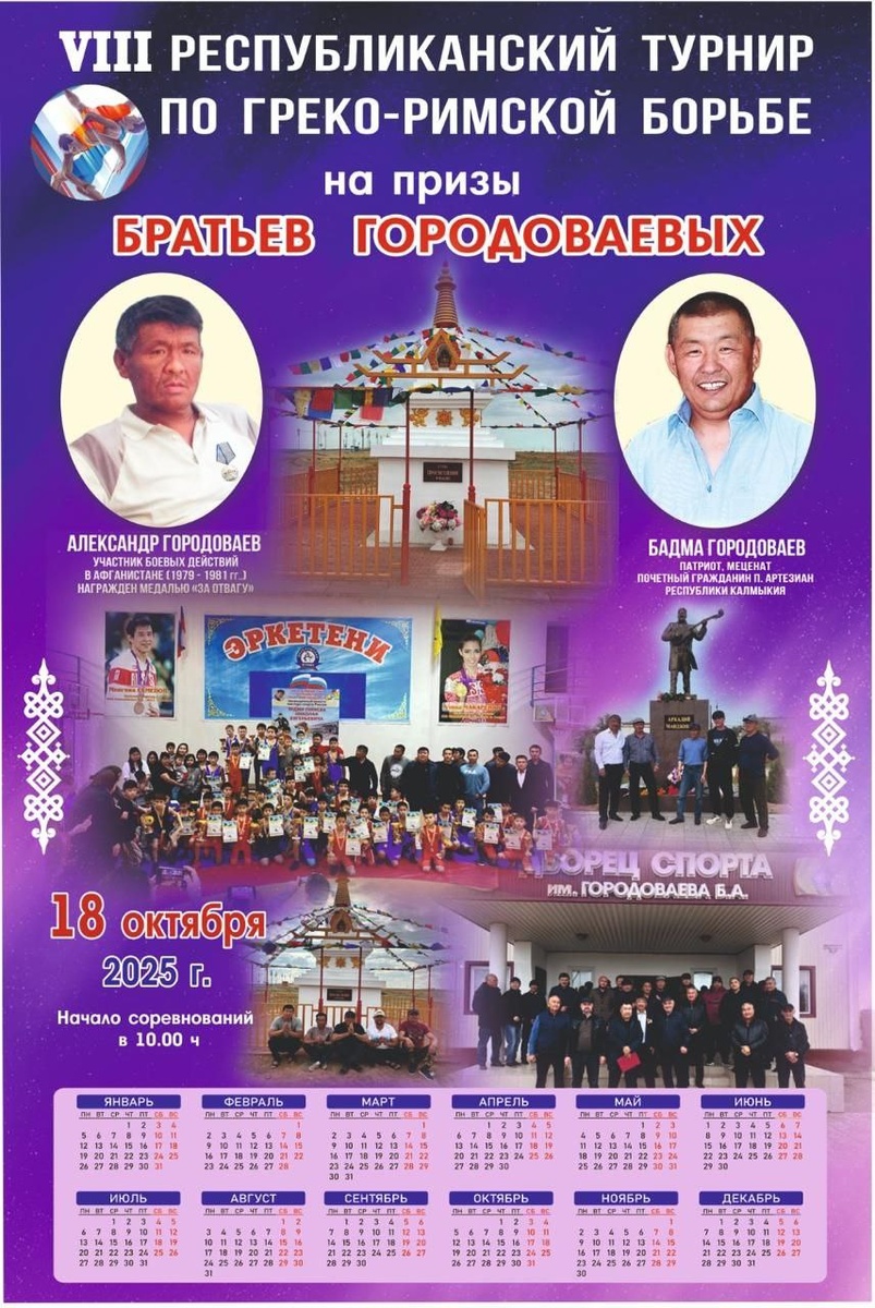 18 октября 2025 года в п. Артезиан Черноземельского района Республики Калмыкия состоится традиционный, в этот раз VIII Республиканский турнир по греко-римской борьбе на призы братьев Городоваевых – Александра Анатольевича и Бадмы Анатольевича. Спортивное состязание памяти известных и достойных наших современников-земляков всегда собирает множество юных участников. став определенной путевкой в еще бОльшую спортивную жизнь будущим чемпионам. А то, что делает Юрий Городоваев в память о своих братьях, достойного примера нам всем✊️👍🙏! Не зря говорят, что #кровьневода , #роднаякровь она – такая. #людиКалмыкии #Человек #ЮрийГородоваев #Городоваевы #Артезиан