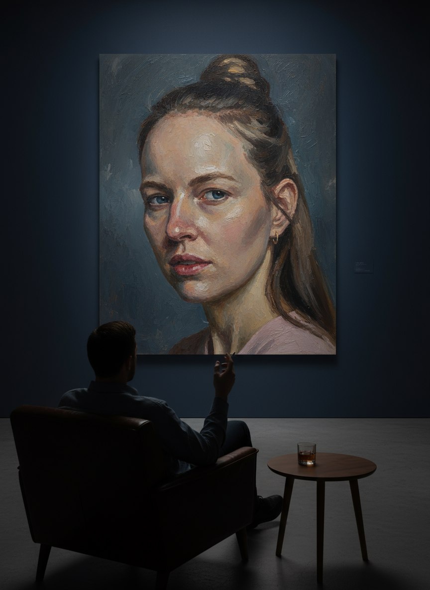 Используем генераторы Gemini или Nana Banana. ✅ Экспериментируйте с образами, героями, деталями — чем креативнее подача, тем больше “вау”-эффекта! Промт 1: Портрет с мужчиной Создайте кинематографическую сцену в галерее современного искусства, используя прилагаемое изображение девушки, сохранив все её оригинальные черты лица не меняя не на 1%. На тёмно-голубой стене висит большой портрет девушки, написанный маслом в реалистичной и экспрессивной манере, с объёмными мазками и приглушённой цветовой палитрой. Освещение мягкое и направленное, подчёркивает текстуру картины и создаёт ощущение глубины пространства. В зале сидит мужчина, задумчиво рассматривающий портрет мужчина сидит в кресле спиной к нам