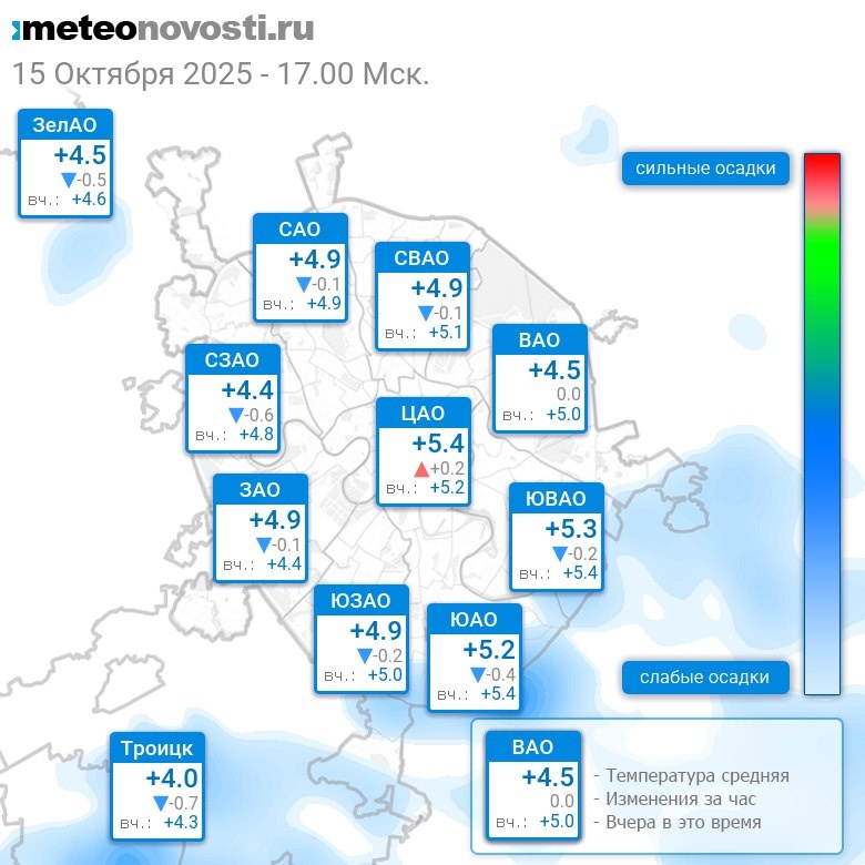 В 17:00 в Москве было от +3.8°C до +5.7°C, средняя температура +4.9°C #погода #Москва #осень #температура #15октября #среда Перейти на сайт Прогноз погоды на 14 дней