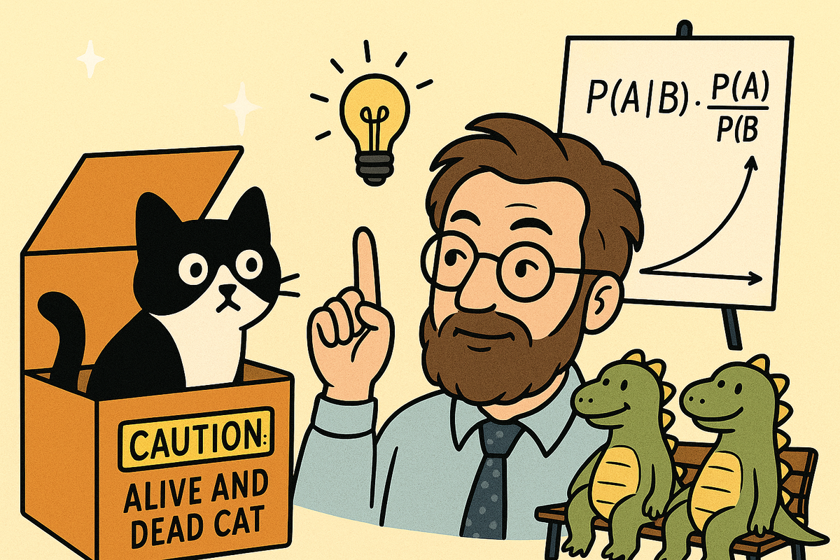 Парадокс кота Шрёдингера — идеальная метафора вероятностного знания. Пока коробка закрыта, кот и жив, и мёртв одновременно. После открытия мы видим лишь один исход — но изменился не кот, а распределение нашей уверенности.