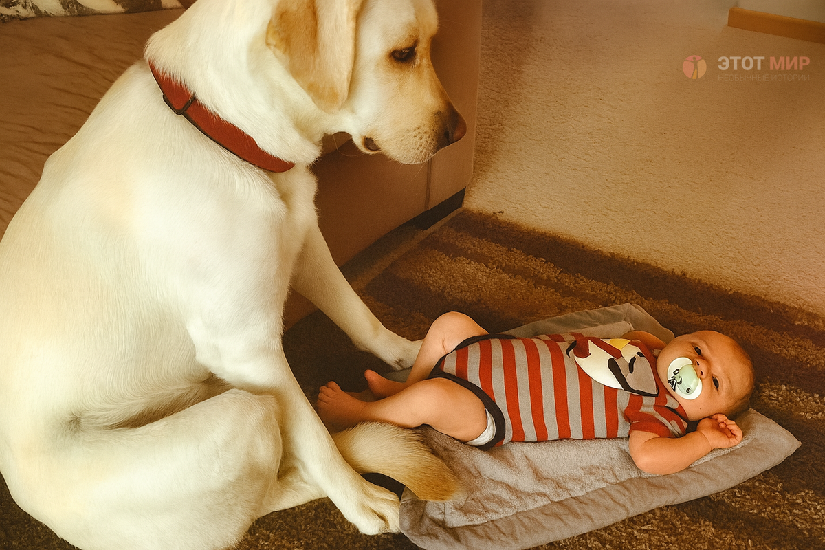 История о том, как одна собака спасла ребёнка, и если бы не камера, никто бы не поверил. Если бы не камера, никто бы не поверил, что именно сделала эта собака. Ольга вышла на кухню всего на пять минут. Таймер хлебопечки визжал, руки в муке и масле - новый заказ, всё горит. Она аккуратно усадила шестимесячного Даньку на серый коврик, вложила пустышку в рот, поправила капюшон. – Только не двигайся, малыш, – шепнула и поцеловала лоб. У двери легла Люся - светлая лабрадорша с глубокими янтарными глазами. Она не играла. Она сторожила. Её уши были насторожены, взгляд прикован к маленьким ручкам ребёнка. Что-то в воздухе было не так. Резкий металлический запах. Батарейка. Утром Ольга уронила пульт и, как ей казалось, всё подобрала. Но одна маленькая батарейка закатилась под диван. Люся это видела. Теперь рука Даньки тянулась к блестящей точке. Низкое рычание прорезало воздух. Люся прижала лапой ножки ребёнка, мягко, но твёрдо. Данька замычал от возмущения, потянулся сильнее. Люся метнулась -
