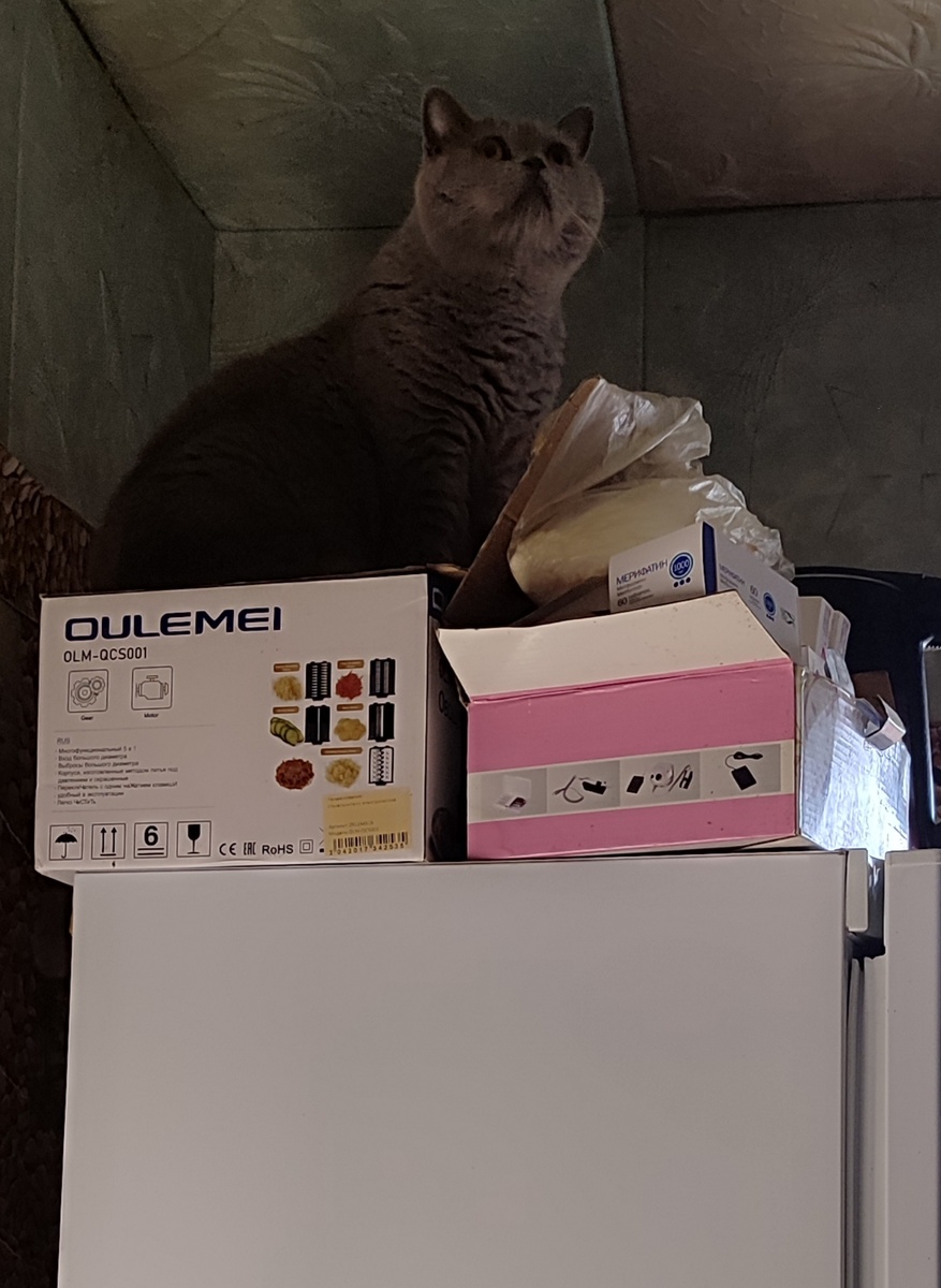 Котик, сидя у меня на ручках, удивленно увидел, что есть неизведанное пространство на холодильнике и потребовал немедленно его туда посадить