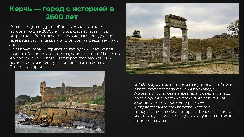 🟧 Почему Керчь? Керчь — настоящая жемчужина восточного Крыма. Город расположен на стыке эпох и морей, окружён сразу четырьмя акваториями: Керченским проливом, Азовским и Чёрным морями, а также солёным озером Сиваш, известным как «Гнилое море». Здесь история, природа и море сливаются в яркий и самобытный образ. 🟧 Гора Митридат — одна из главных достопримечательностей Крыма. К вершине ведёт парадная лестница 1840 года, состоящая из 423 ступеней. Руины Пантикапея — на вершине горы расположены остатки античного города с колоннами, арками и фрагментами древних стен. Крепости — сохранились исторические фортификации: мощная крепость «Керчь» и живописная «Ени-Кале». Пляжи — уникальная особенность керченского побережья — выход сразу к двум морям: Чёрному и Азовскому. Оздоровление — Керчь славится целебным воздухом, грязевыми и солевыми ваннами, а также природными условиями, способствующими восстановлению здоровья. 🟧Почему бутик апарт отель Боспор ? 🟧Одной из самых загадочных и древних стр