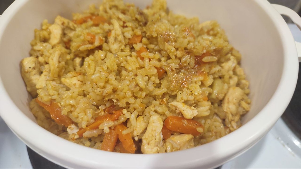 Пока она греется — вливаем масло, слышим это шипение — значит, пошло дело. Когда на таймере 22 минуты, закидываем мясо — нарезано средними кубиками, без фанатизма. Помешиваем пару раз, даём курице схватиться и выпустить аромат. ⏱️ На 17–16 минутах — в бой идёт лук.