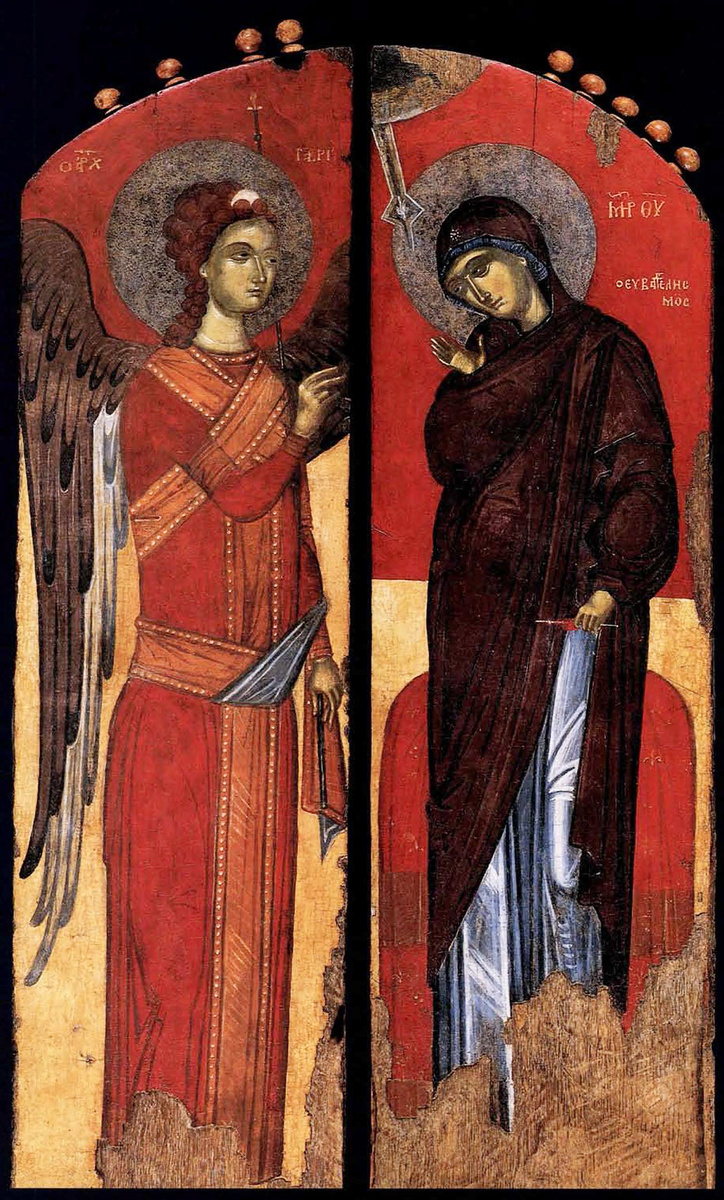 Две створки алтаря с Благовещением образуют лаконичную, строгую композицию, ограниченную двумя фигурами. Изображение полностью статично, и движение отсутствует даже у вестника Гавриила, который обычно движется по направлению к Богородице. Эта статичность автоматически заставляет взгляд зрителя уловить единственное движение на иконе в условном треугольнике, образованном лучом Святого Духа, рукой благословляющего ангела и рукой Богородицы, принимающей весть. На красном фоне охрой написаны следующие надписи: «Архангел Гавриил», «Богоматерь» и «Благовещение». Луч небесного света, содержащий Святого Духа в виде маленького голубя, исходит из полукуполов и падает на нимб Девы Марии. Ангел, облаченный в императорские одежды, с перекрещенным на груди лоросом, украшенным жемчугом, держит посох глашатая. Богоматерь, в темно-фиолетовом мафории, завязанном высоко на шее, и серо-голубом платье, только что встала с красной скамейки, на которой пряла, и, всё еще держа веретено, подняла правую руку