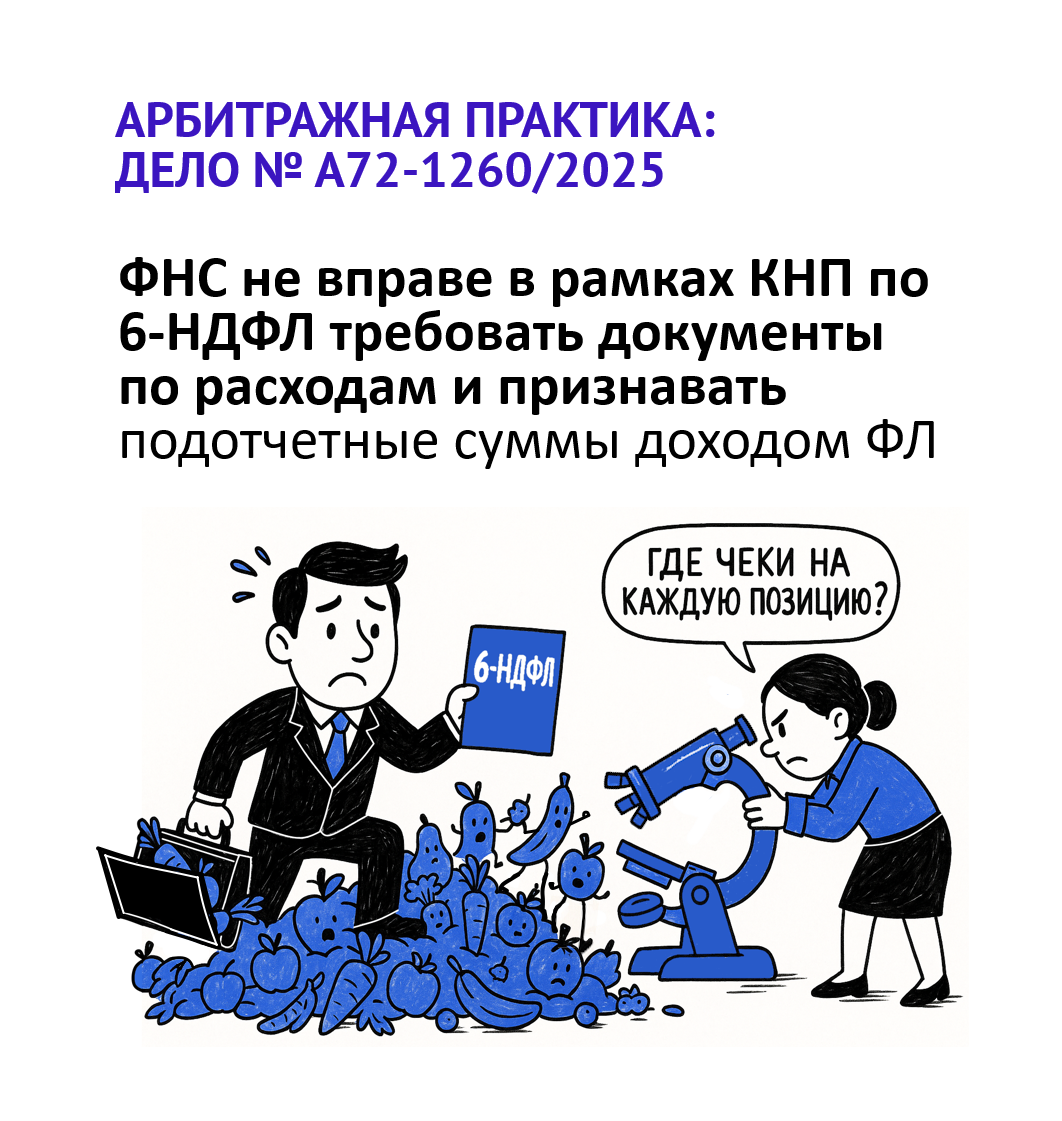 Фабула А72-1260/2025: ФНС провело камеральную налоговую проверку расчета 6-НДФЛ за 2023 год. В ходе проверки было установлено, что директор Общества получил со счета компании средства в качестве командировочных расходов, на хозяйственные нужды и путем снятия наличных.