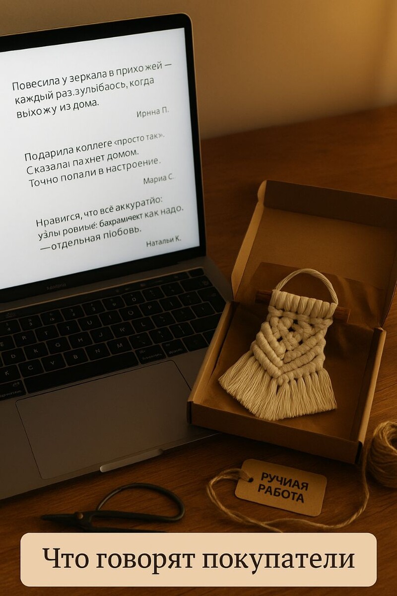 Про себя говорить сложно - пусть скажут те, кто уже получил свои заказы. Немного тёплых слов, которыми очень дорожу: - "Повесила у зеркала в прихожей - каждый раз улыбаюсь когда выхожу из дома"- Ирина П. -"Подарила коллеге"просто так". Сказала: пахнет домом. Точно попали в настроение"- Марина С. -"Нравится, что всё аккуратно:узлы ровные, бахрома лежит как надо, упаковка отдельная любовь"- Наталья К. Спасибо вам за доверие. Если хотите, покажу больше живых фото и расскажу какие цвета сейчас доступны. Пишите мне @Olghagunicheva