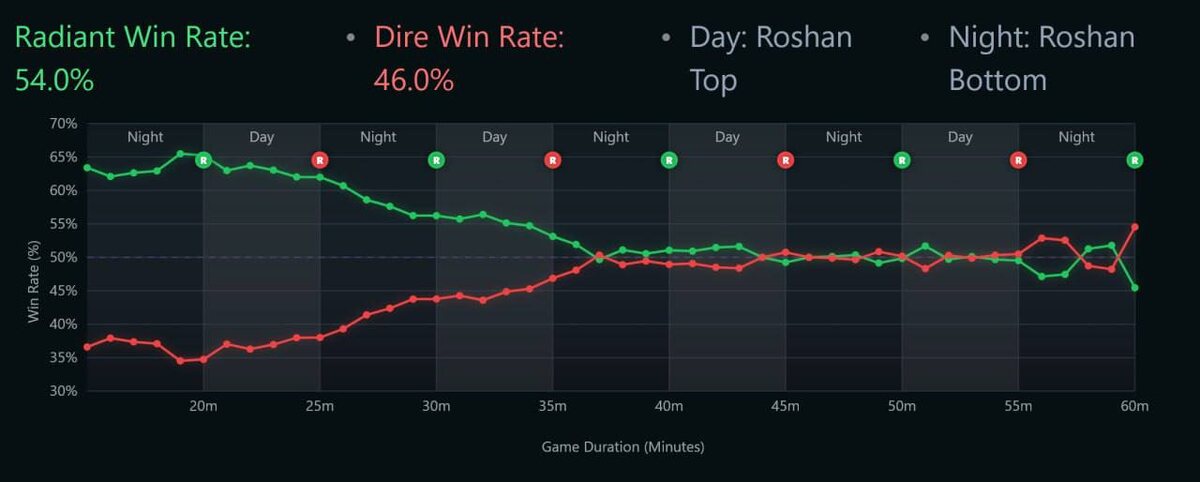Свет против Тьмы Винрейт рэдиант 54%, у даер всего 46% Показатели меняются в зависимости от длительности матча, на 20 минуте у Света 64%, а после 55 минуты лидирует Тьма