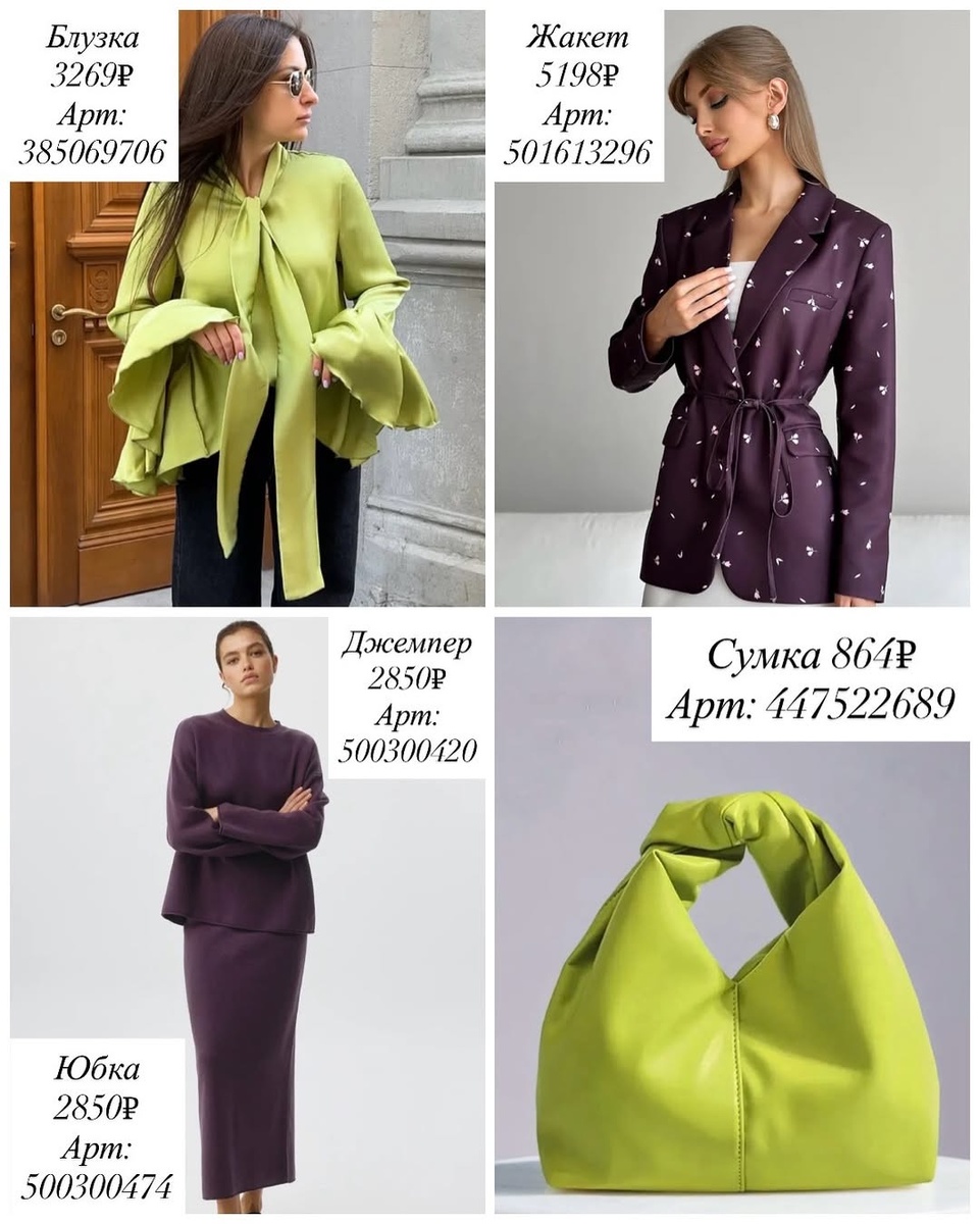 - Офис с характером: джемпер 500300420 + юбка 500300474 + сумка 447522689. Лайм работает как точка света, а слива формирует строгую основу.