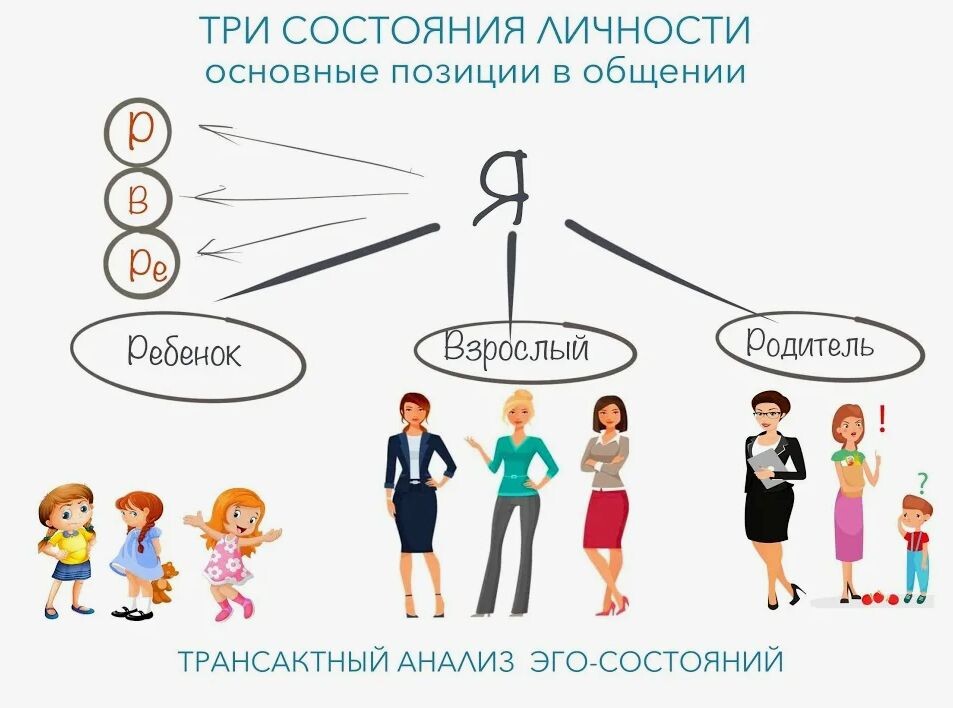 Для анализа позиций в общении используют модель трансактного анализа Эрика Берна 🔹родитель позиция проявляется в критическом, оценочном поведении по отношению к другим, в оказании покровительства, защиты и протекции. 🔹взрослый состояние, направленное на объективную оценку реальности, основа реалистического поведения. Будучи ориентировано на сбор и анализ объективной информации, оно организовано, активно, разумно, адаптивно и действует, хладнокровно, оценивая ситуацию и бесстрастно рассуждая. 🔹ребёнок эмоционально-непосредственное начало в поведении человека. Позиция включает укоренившийся в структуре личности ранний детский опыт взаимодействия с окружающими. В любой момент каждый человек может быть в состоянии либо Взрослого, либо Родителя, либо Ребенка, и в зависимости от этого состояния ведется разговор, определяются позиции и статус собеседника. подробнее... С заботой и любовью, ваш Душевный Wi-Fi ❤️