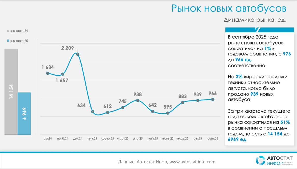 Автобусный рынок на развилке: сентябрьский «плюс» к августу, но 9 месяцев — на минимуме По данным «Автостат Инфо», рынок новых автобусов в России в сентябре сократился на 1% год-к-году: с 976 до 966 единиц. При этом к августу зафиксирован небольшой отскок на 3% (с 939 ед. до 966 шт.), что указывает скорее на техническую стабилизацию после слабого лета, чем на перелом тренда. За январь–сентябрь 2025 года продажи упали вдвое — на 51%, с 14 154 до 6 969 единиц, то есть рынок вернулся к уровням «антикризисного» минимума. С точки зрения помесячной траектории видна характерная «волна»: после провала в январе (около 634 шт.) весенний отскок до апрельских 938 шт. сменился просадкой в июне (595 шт.), а затем — медленным восстановлением к августу (939 ед.) и сентябрю (966 шт.). Это отражает смещение закупочных календарей и более растянутые циклы согласований у публичных заказчиков на фоне высоких ставок и строгой бюджетной дисциплины. В разрезе брендов сентябрь показал неоднородную картину. П