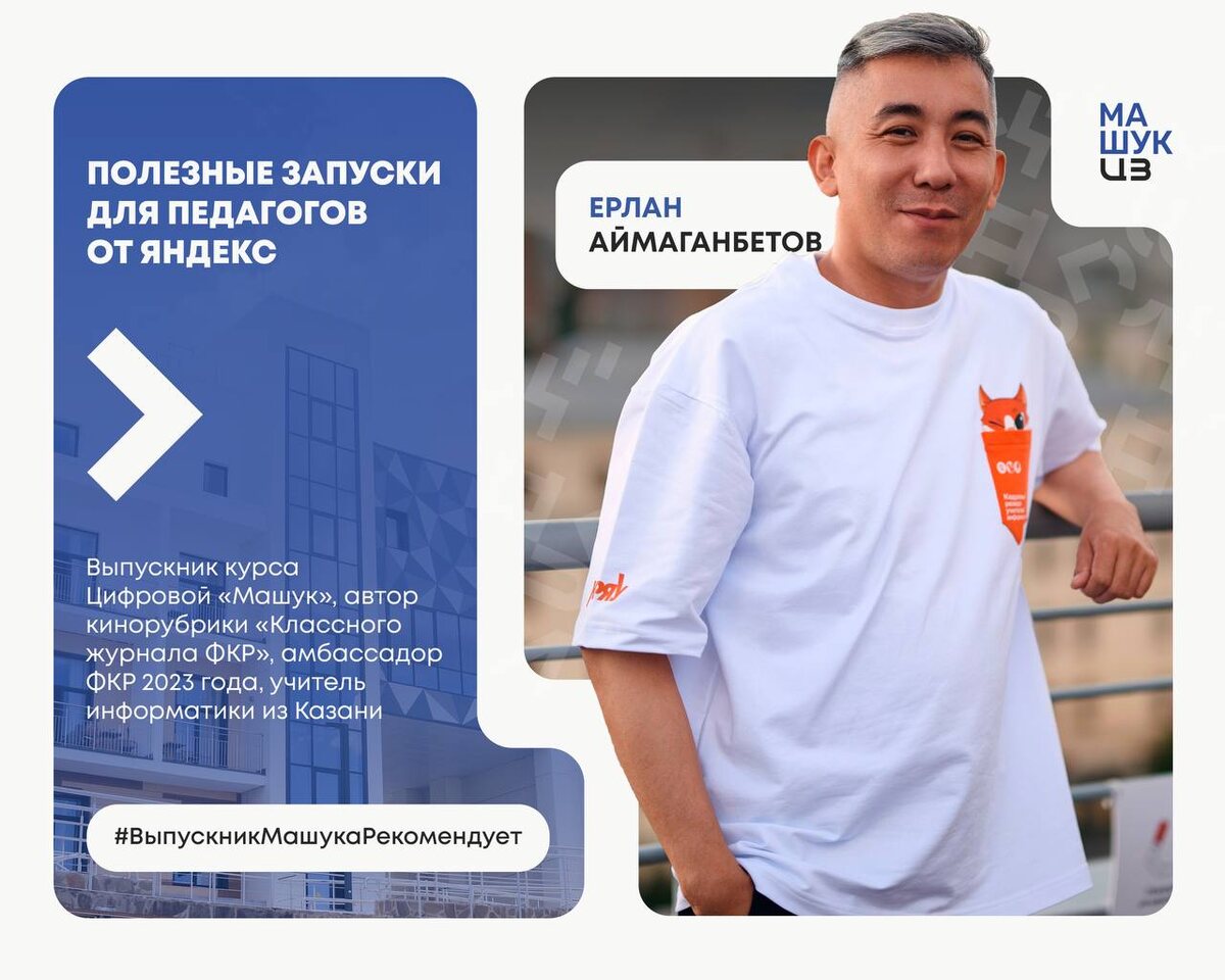 Когда педагог со вдохновением учится сам — его ученики тянутся за ним 👨🏫 В нашей новой рубрике #ВыпускникМашукаРекомендует мы делимся находками и инструментами, которые помогают педагогам расти, вдохновляться и идти в ногу со временем. Первым героем стал Ерлан Аймаганбетов — выпускник курса «Цифровой Машук», учитель, амбассадор и человек, для которого цифровая среда — не просто инструмент, а способ развивать учеников и себя. 📂 Вместе с Ерланом собрали полезные запуски от Яндекса — для тех, кто хочет сделать обучение технологичным, интересным и понятным детям: 👉Диагностика по информатике 👉Дополнительное образование в Яндекс Учебнике Сохраняйте себе и делитесь с коллегами — в таких идеях рождается современная школа. ⬆️